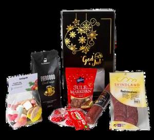 Innhold: Festpølse med Aquavit 200 g, Rødvinssalami 100 g, Babybel i nett 120 g, Marsipan og sjokoladepose Nidar 130 g, Julens smågodt blanding 250 g, Evergood Dark Roast filtermalt 250 g Pakkes i gaveeske med vindu og med teksten God Jul