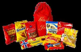 Innhold: Melkesjokolade 220 g, Bamsemums 115 g, Cloetta Juleskum 100 g, Goody 90 g, Walkers 150 g, Smash 100 g Pakkes i rød striesekk med teksten God Jul