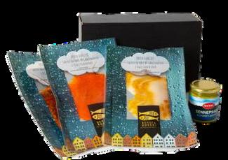 Innhold: Røkt laks skivet 100 g, Kalkunbryst marinert 80 g, Ribberull skivet 100 g, Oliven olje naturell nr 1 100 ml, Evergood Dark Roast filtermalt 250 g, Snack Crackers Salted 100 g, President Gourmet Brie 200 g, Marsipan og sjokoladepose Nidar 130 g, Sennep med tryffel 150 g, Bjerke Hummer & Rekesalat 180 g
