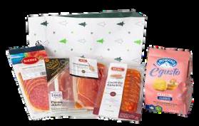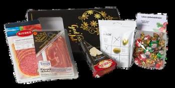 Innhold: Røkt laks skivet 100 g, Kalkunbryst marinert 80 g, Ribberull skivet 100 g, Oliven olje naturell nr 1 100 ml, Evergood Dark Roast filtermalt 250 g, Snack Crackers Salted 100 g, President Gourmet Brie 200 g, Marsipan og sjokoladepose Nidar 130 g, Sennep med tryffel 150 g, Bjerke Hummer & Rekesalat 180 g, Bjerke Bøkerøkt skinke 120 g Babybel i nett 120 g, Rødvinspølse 200 g, Choco Petit-Beurre 150 g