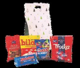Innhold: Marsipan ogsjokoladepose Nidar 130g,Bilar125g, Troika pose 150 g, Stratos plate 65 g, Gott & Blandat 160 g Pakkes i papirpose med julemotiv og bærehåndtak