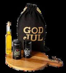 Innhold: Sea Salt Sicily 250 g, Black Pepper Crushed 90 g, Olivenolje nr.1, 100 ml, Skjærebrett rundt Akasie Wood Pakkes i sort striesekk med teksten God Jul
