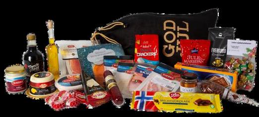 Roast filtermalt 250 g, Snack Crackers Salted 100 g, President Gourmet Brie 200 g, Marsipan og sjokoladepose Nidar 130g, Sennep med tryffel 150 g, Bjerke Hummer & Rekesalat 180 g, Bjerke Bøkerøkt skinke 120 g, Babybel i nett 120 g, Rødvinspølse200g, Choco Petit-Beurre 150 g, Serranoskinke skivet 80 g, Julegløgg 0,5 l, Holmsens Brente mandler 100 g, Melkesjokolade 220g, Grillet svinekam 80 g, Laica Italienske sjokoladekuler 250 g, President gourmet smør med havsalt 250 g, Bjerke Aioli 200 g