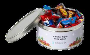 Innhold:Julskumcloetta 100g,Bamsemums115g,Smash100g,Goody90g,Marsipanog sjokoladepose Nidar 130 g Pakkes i metallboks med lokk 185x136 mm