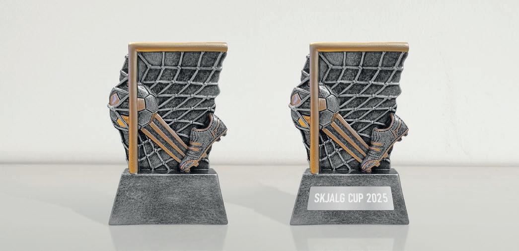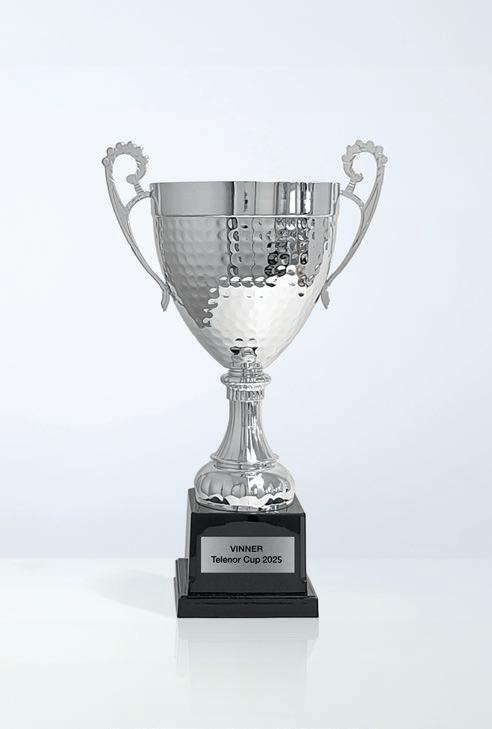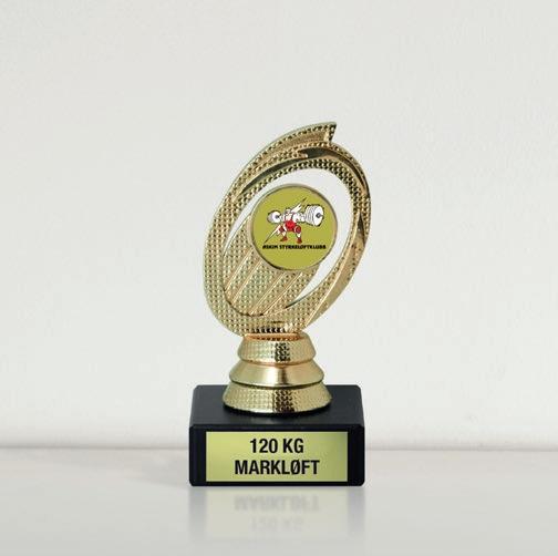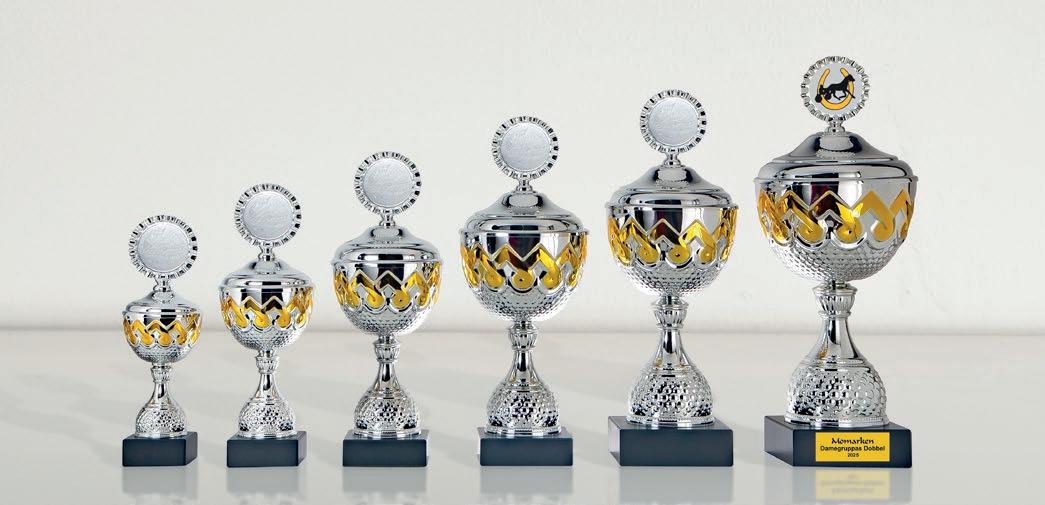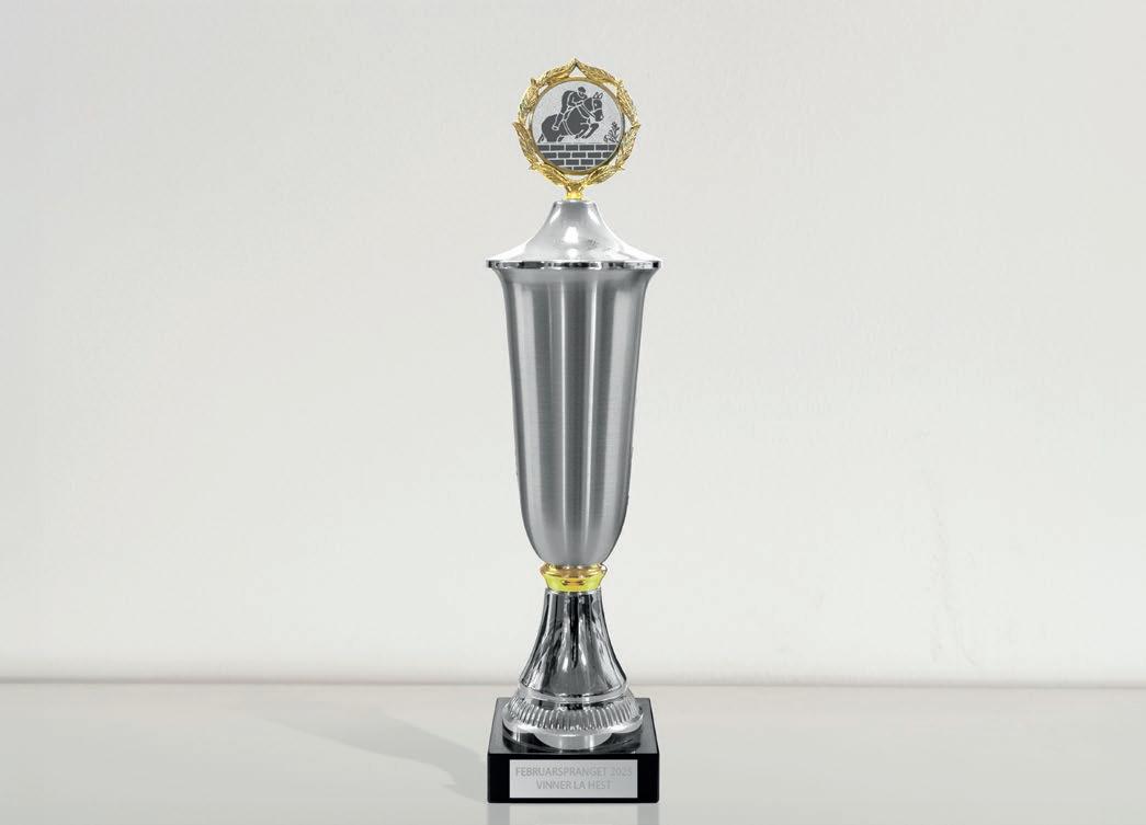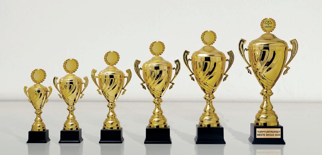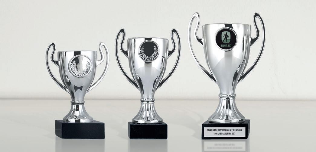 Pokal i metall og kunststoff. Leveres i gull, sølv, bronse og sort. . Skilt eller etikett på sokkel.