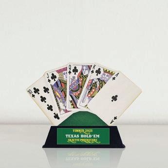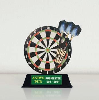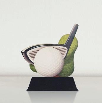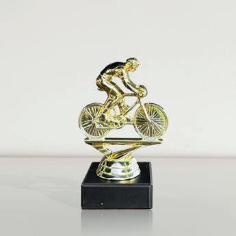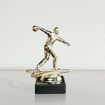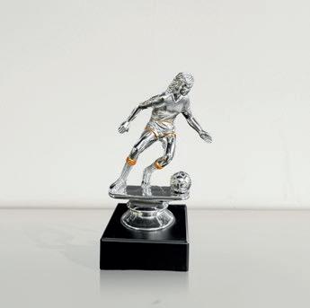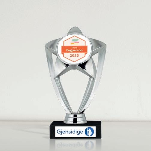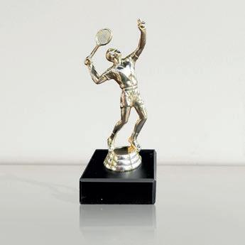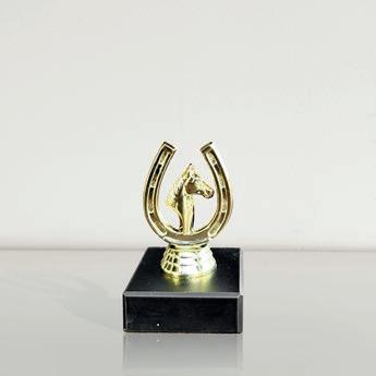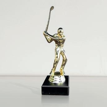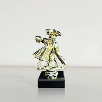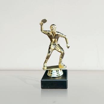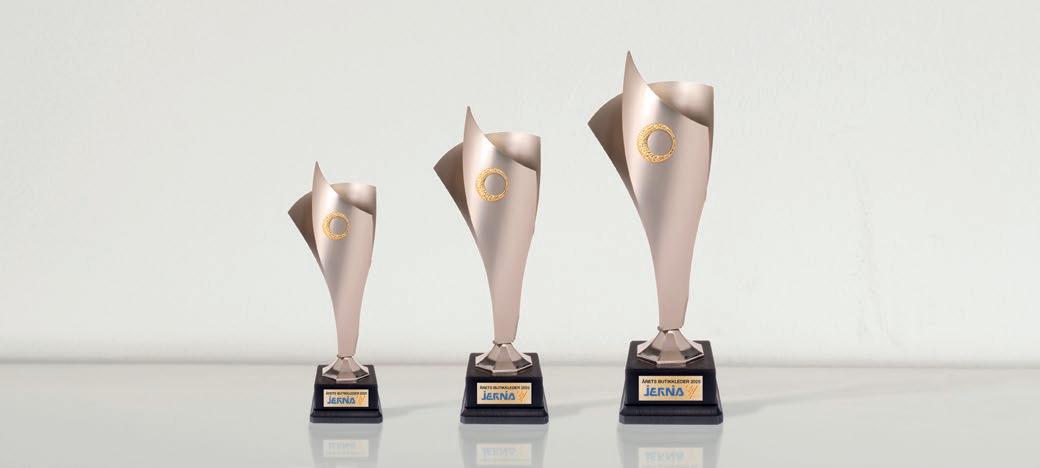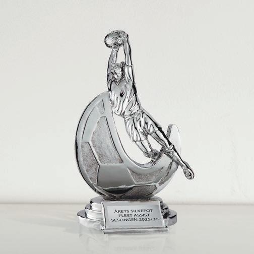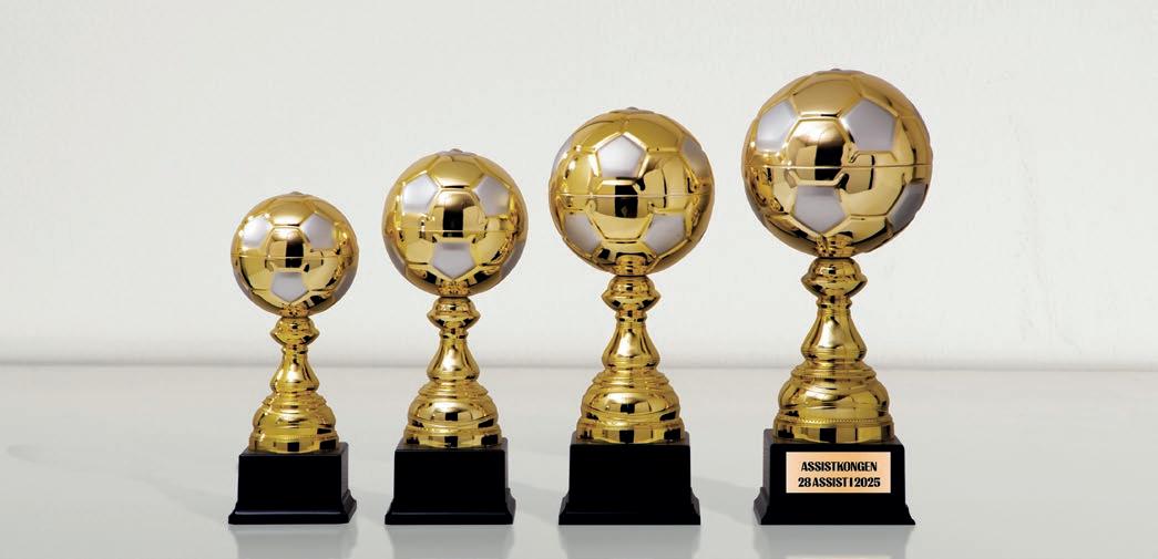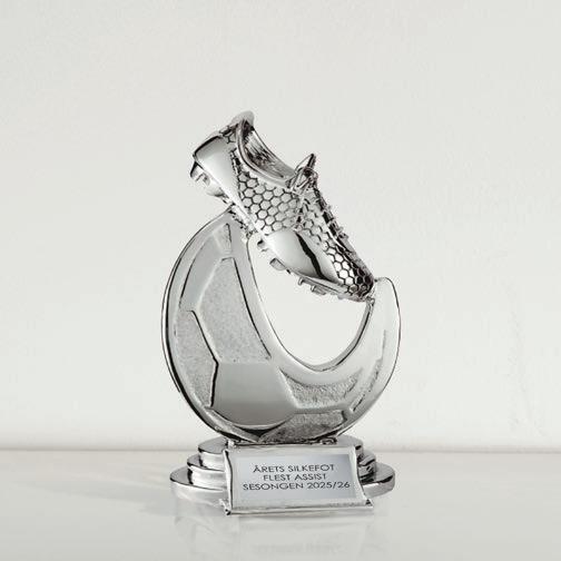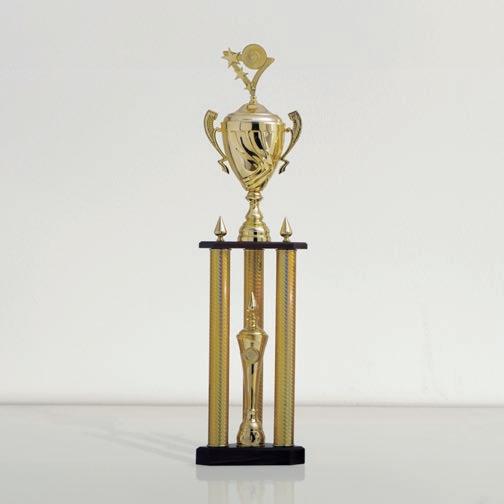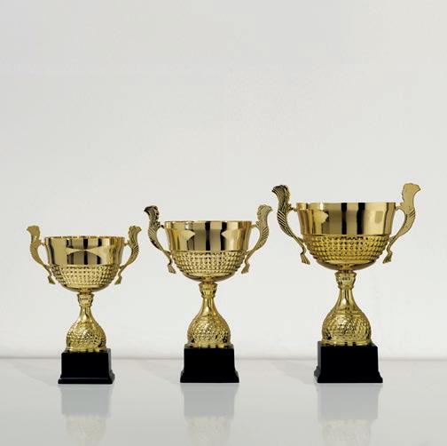 Pokal i metall og kunststoff. Leveres i gull, sølv, bronse og sort. . Skilt eller etikett på sokkel.
