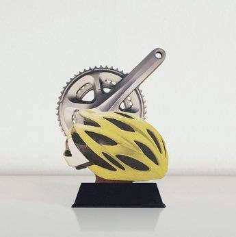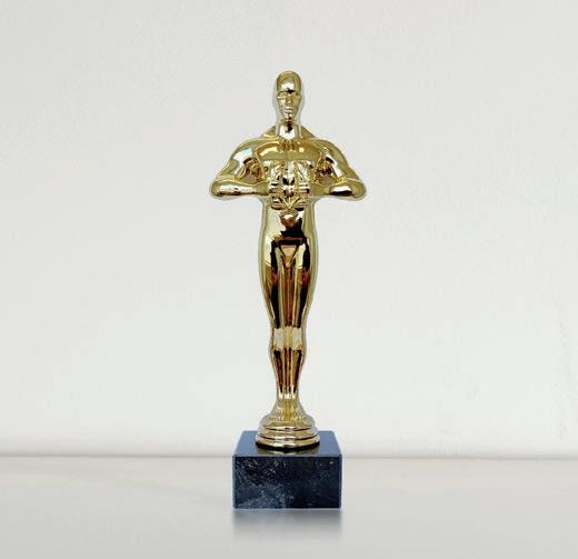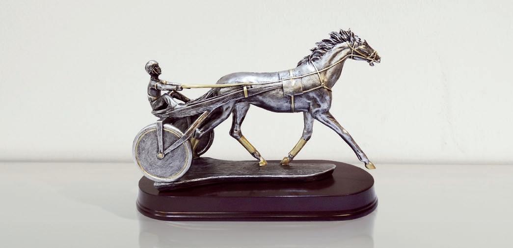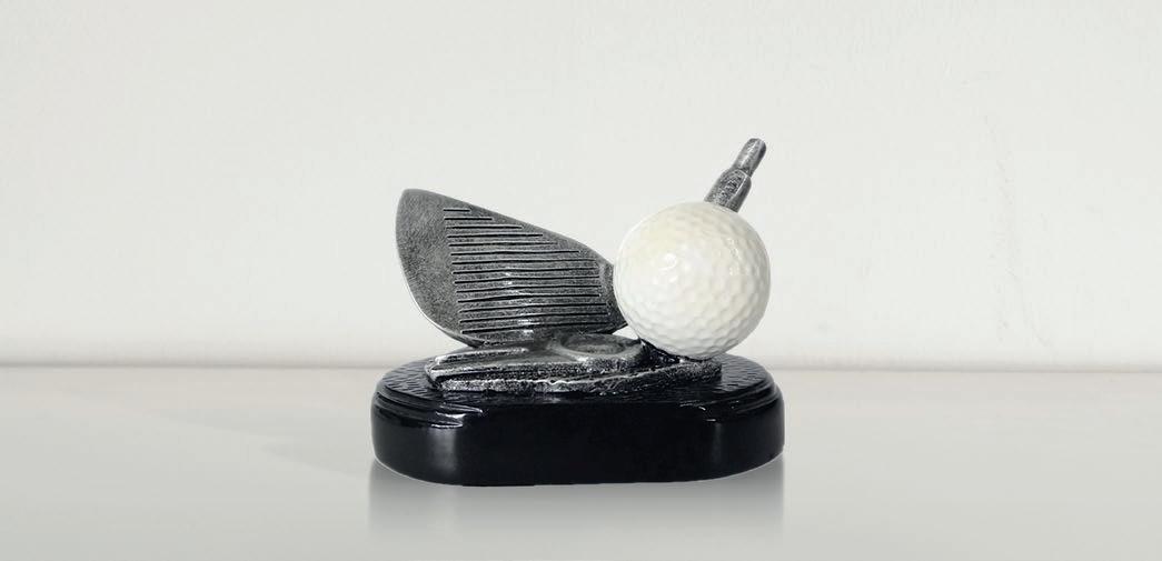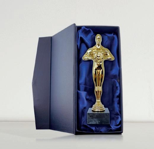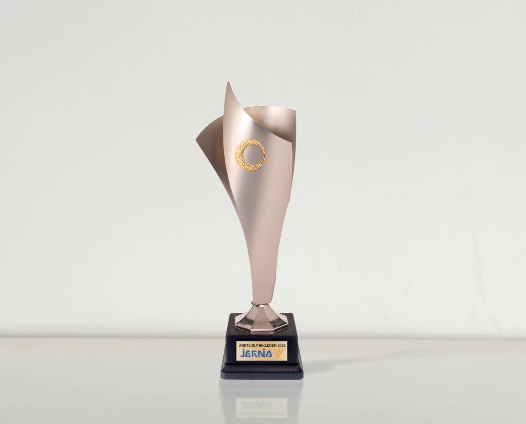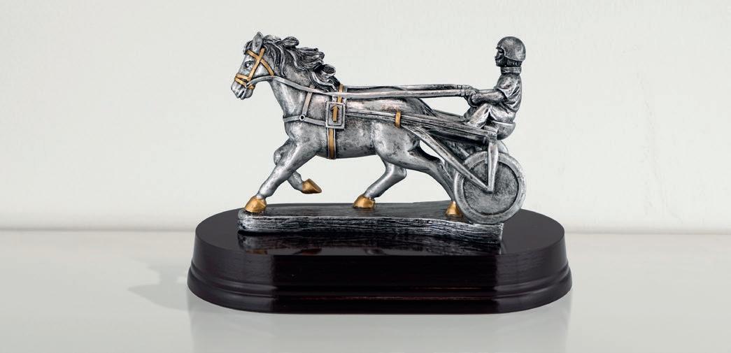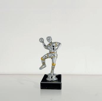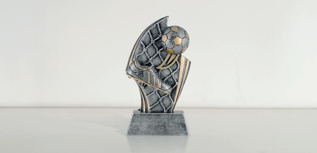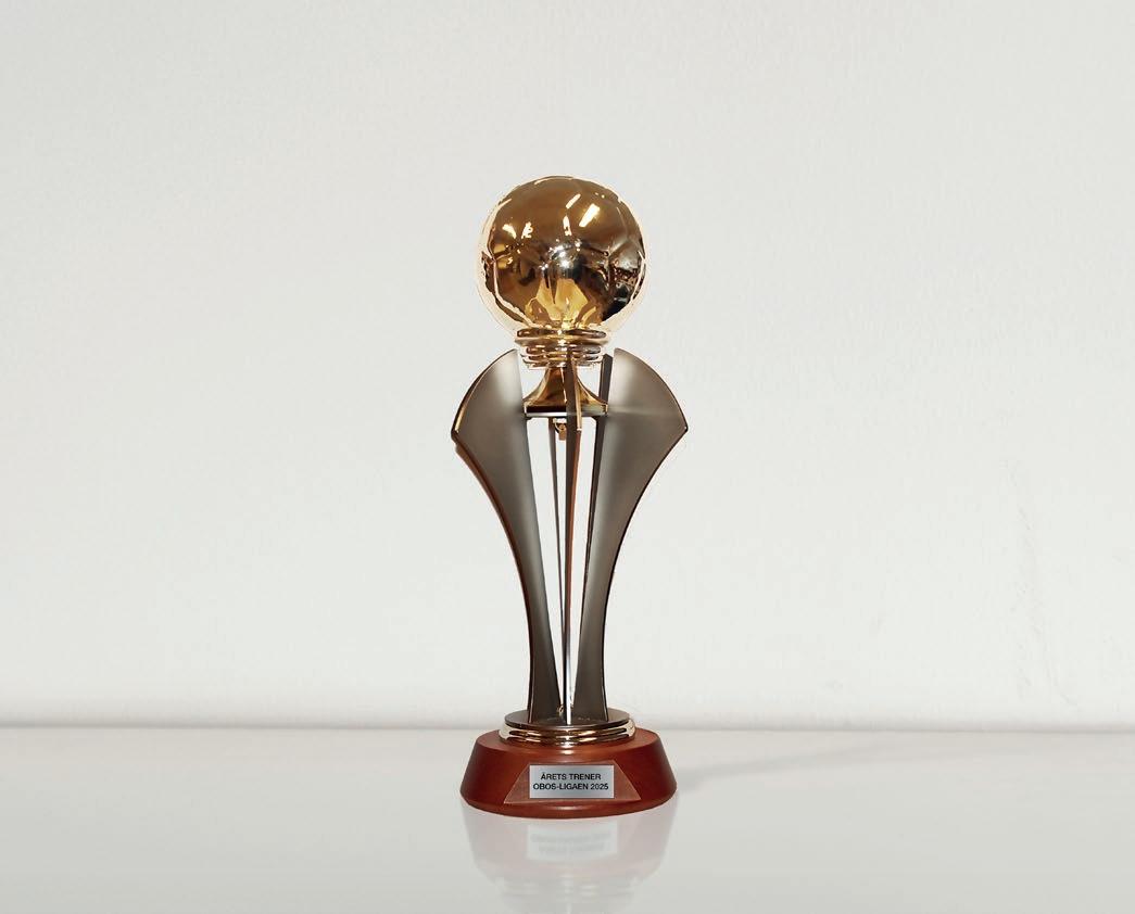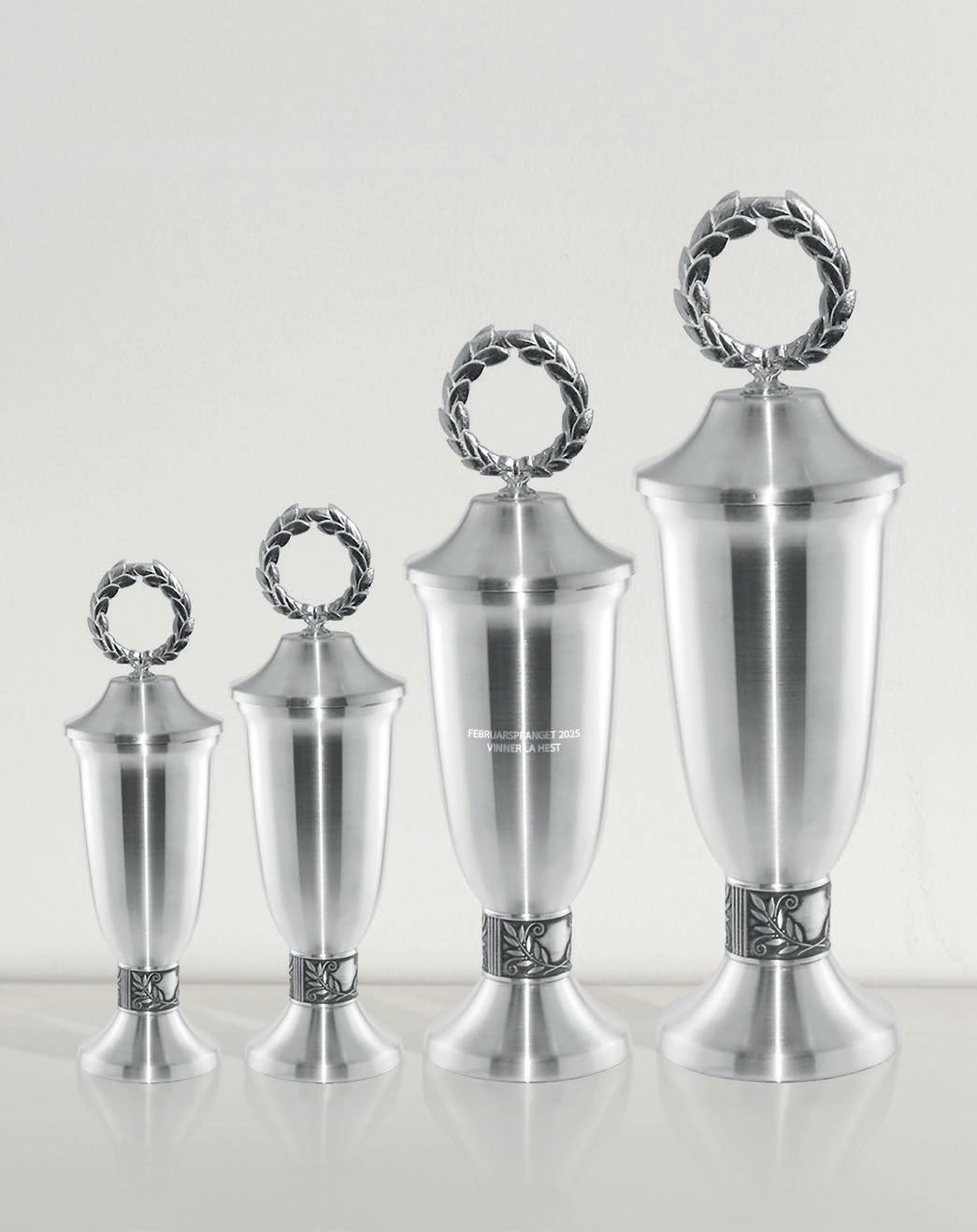 Eksklusiv troféserie i matt titan og “gull”. Fot i sort eik. Det er plass til skilt på sokkelen.