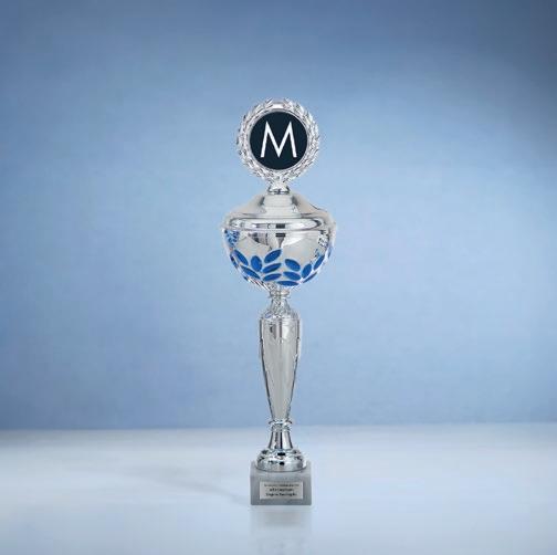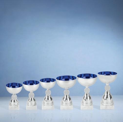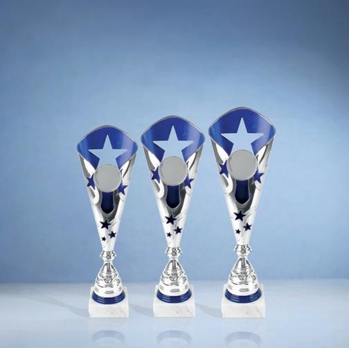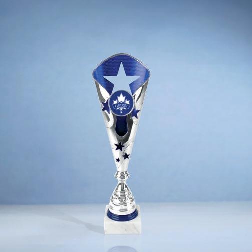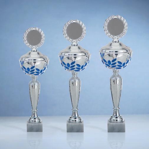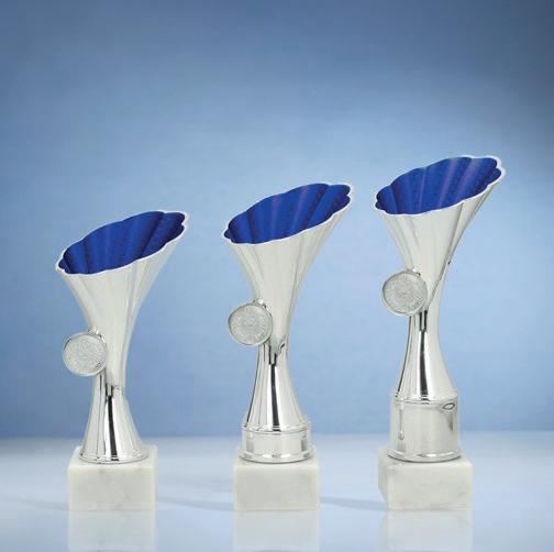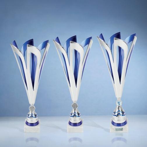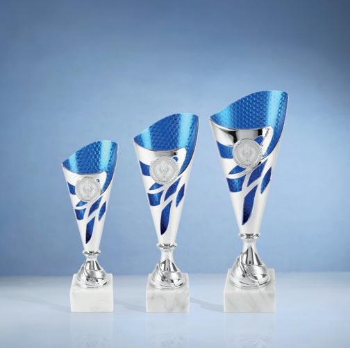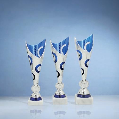 Pokalserie i kunststoff med detaljer i blått. Hvit marmorsokkel