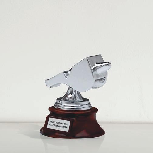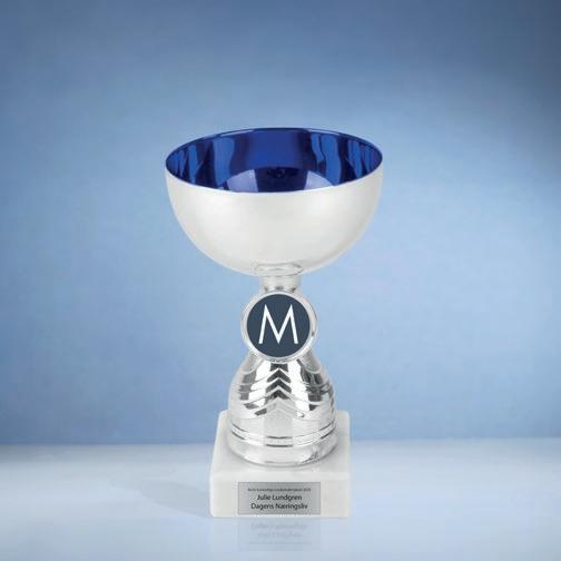 Pokal i metall og kunststoff. Plass til sentermerke eller etikett (Ø:50 mm) oppe og skilt på sokkelen.