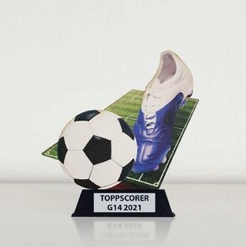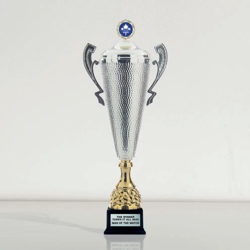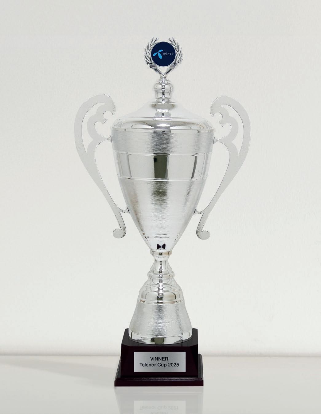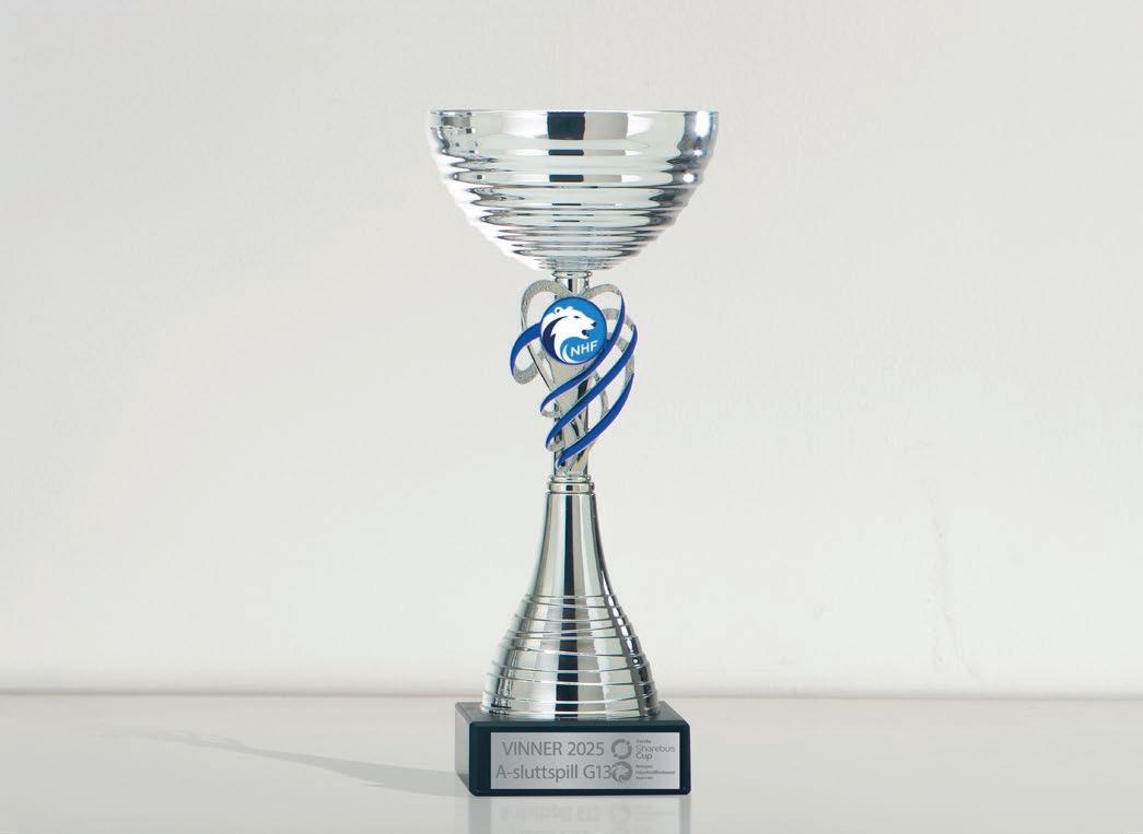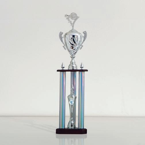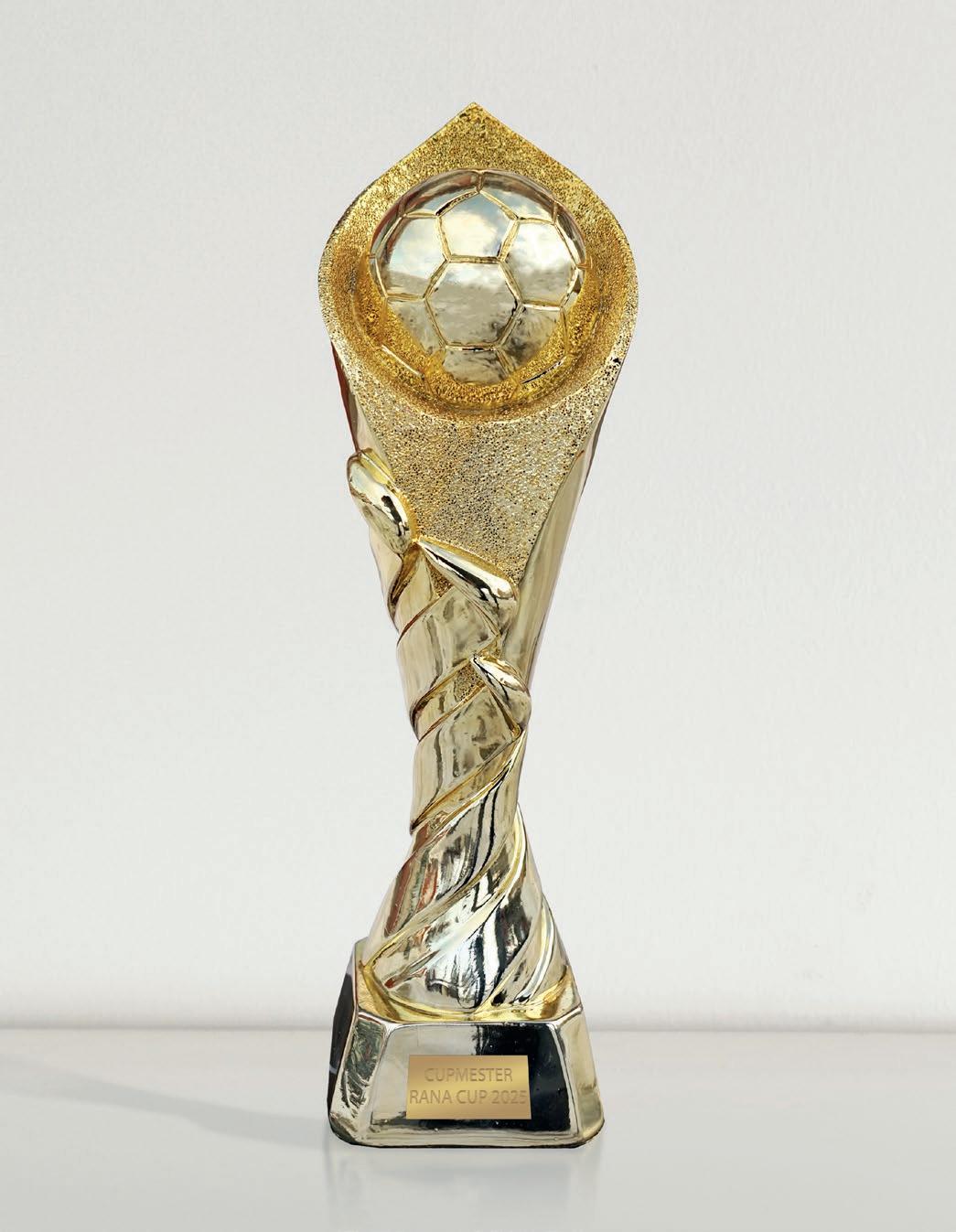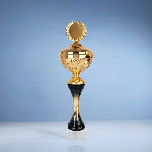 125 cm. Dekoreres med merke oppe og skilt på tresokkelen. Vis din anerkjennelse overfor prestasjonen på en storslått måte med denne imponerende pokalen. Metall og kunststoff.