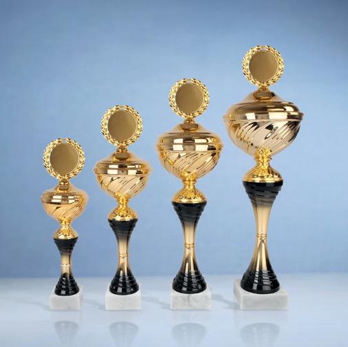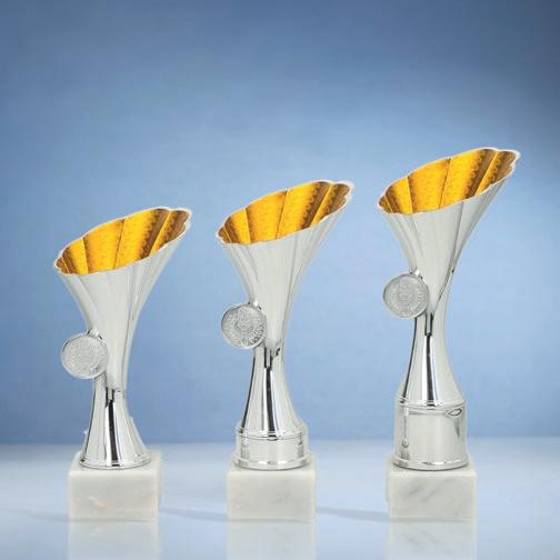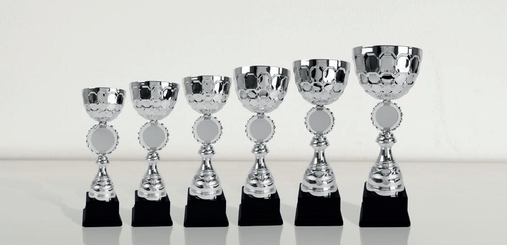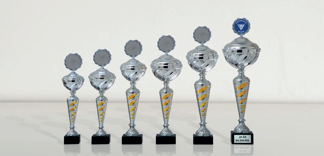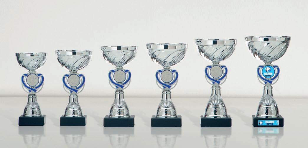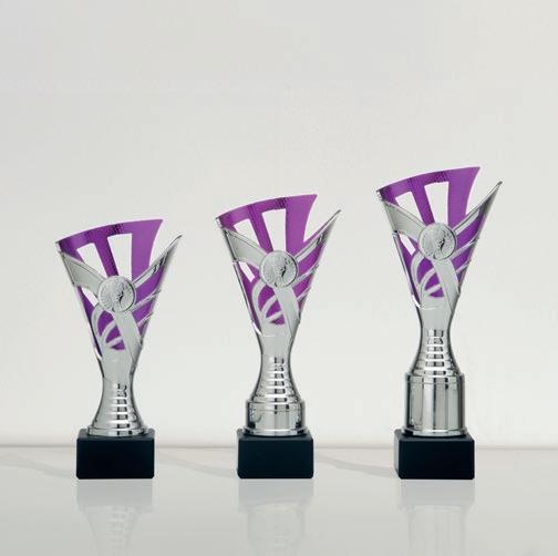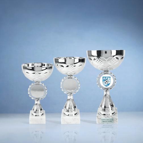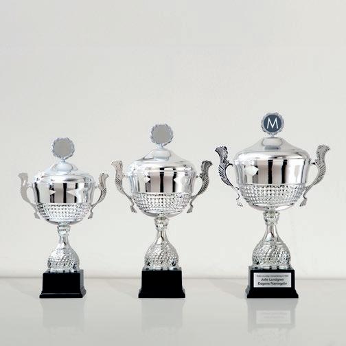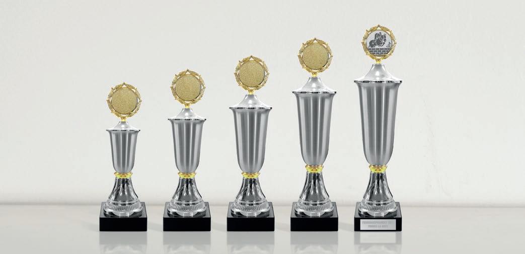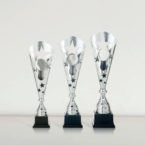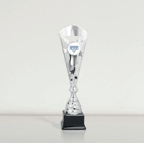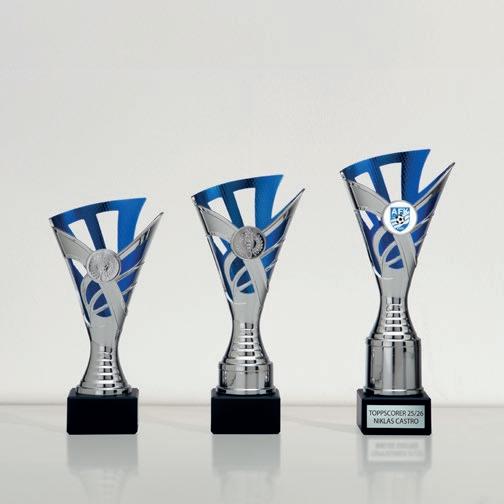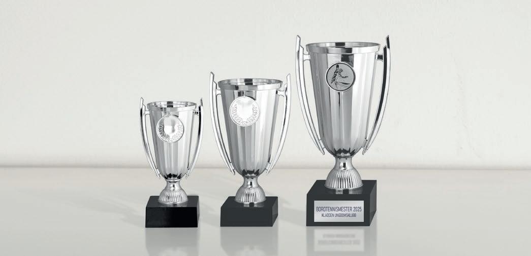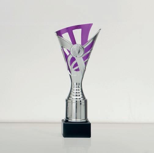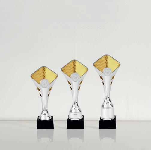Pokalserie i kunststoff. Plass til sentermerke (Ø:25 mm) og/eller etikett eller skilt på sokkel.