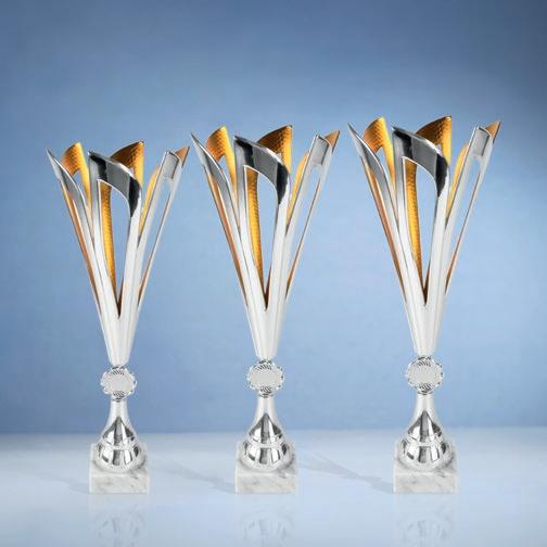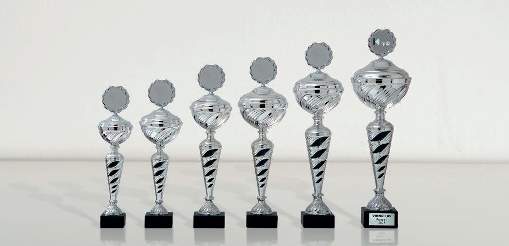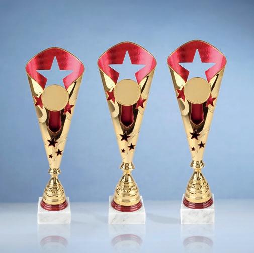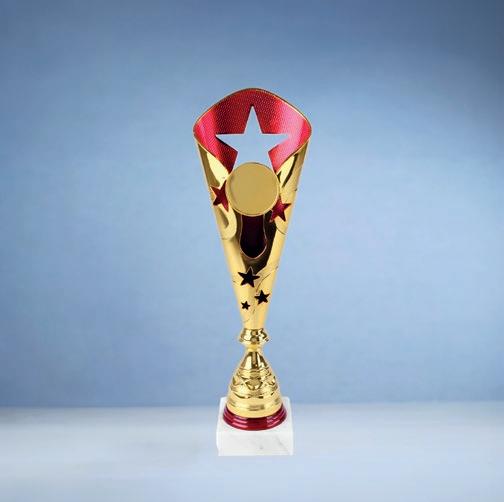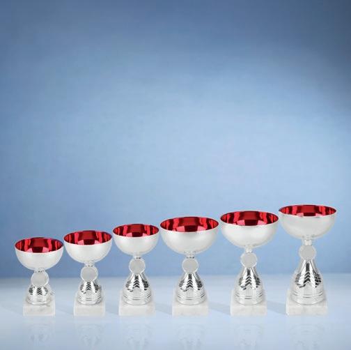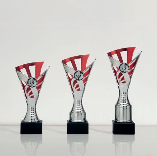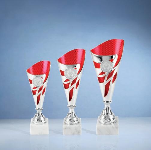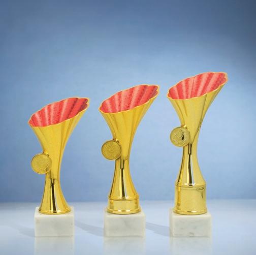 Pokalserie i metall og kunststoff med røde detaljer. Leveres med hvit marmorsokkel. Plass for sentermerke (Ø:50 mm) og skilt eller etikett på sokkel.