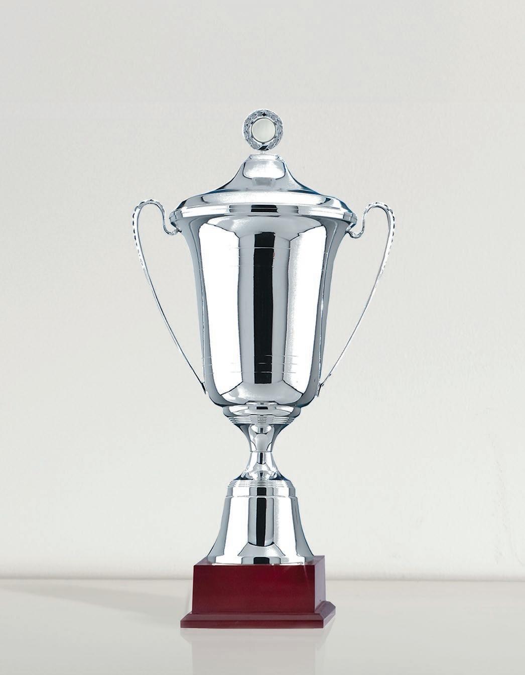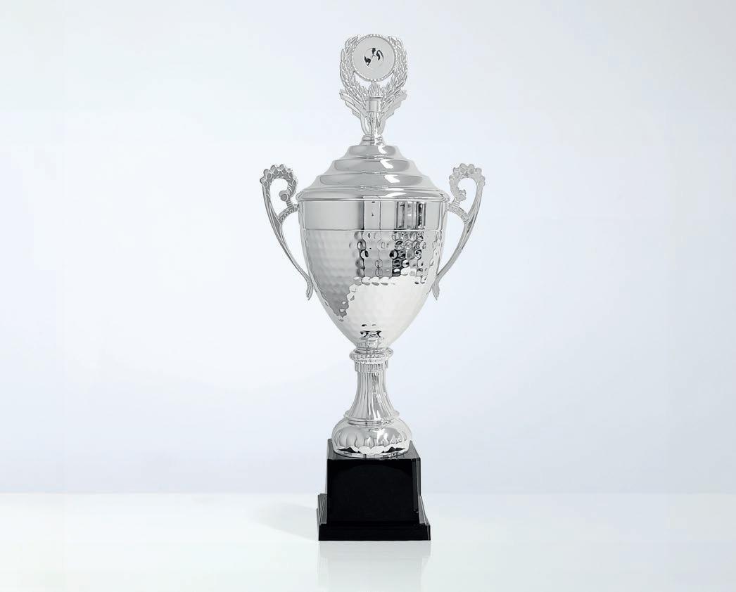 Eksklusiv Pokal i metall. Plass til sentermerke eller etikett oppe (Ø:50 mm) og skilt på sokkelen.