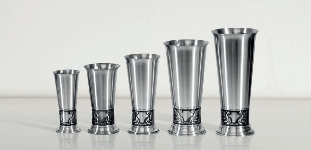 93% rent tinn, 7% antimon og vismut. Vi graverer rett på pokalene. Antimon brukes for å gjøre tinnet i pokalene mer motstansdyktig mot slag og riper. Vismut brukes under støpingen fordi den utvider seg når den størkner, og dermed gir flottere konturer.