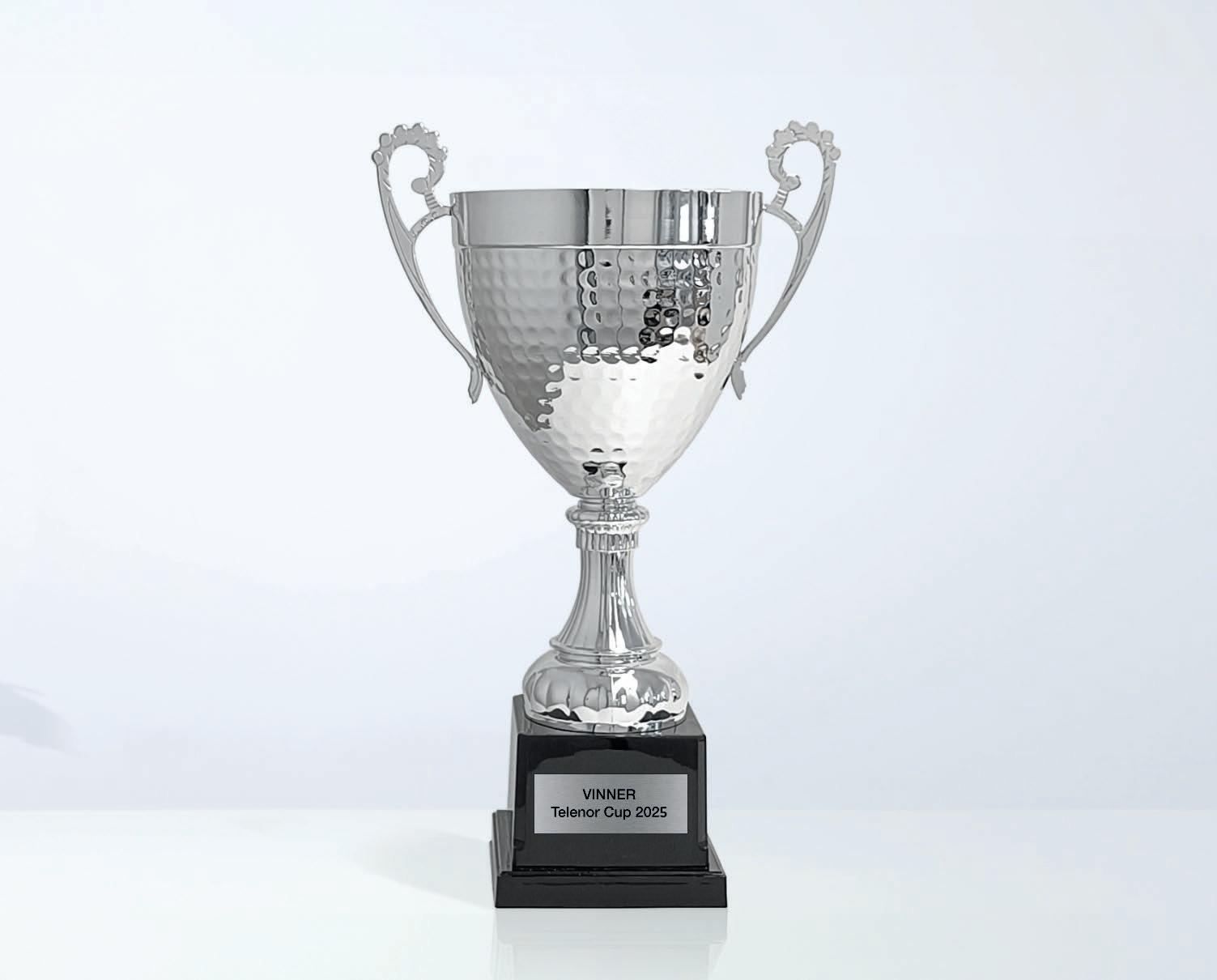 Pokal i metall. Plass til stort skilt på sokkelen.