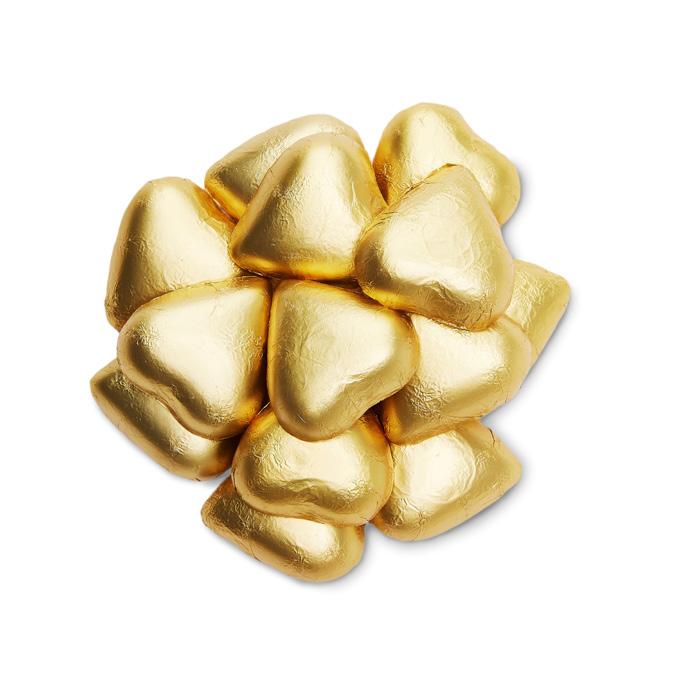 Ingen alla hjärtans dag utan choklad! Mjölkchokladhjärtan inslagna i folie - ett innehåll som faller många i smaken. Välj mellan vackert röda hjärtan eller glimrande guldhjärtan.