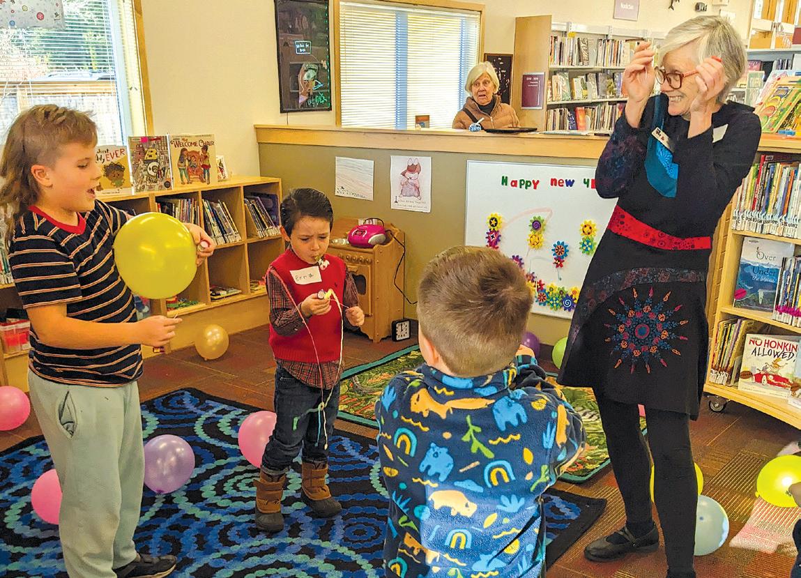 s Children librarian Rose Momsen anticipating a popped balloon during a New Year’s Eve day party at the Point Roberts Library on Gulf Road. Children and their families watched the balloons drop at noon on December 31.