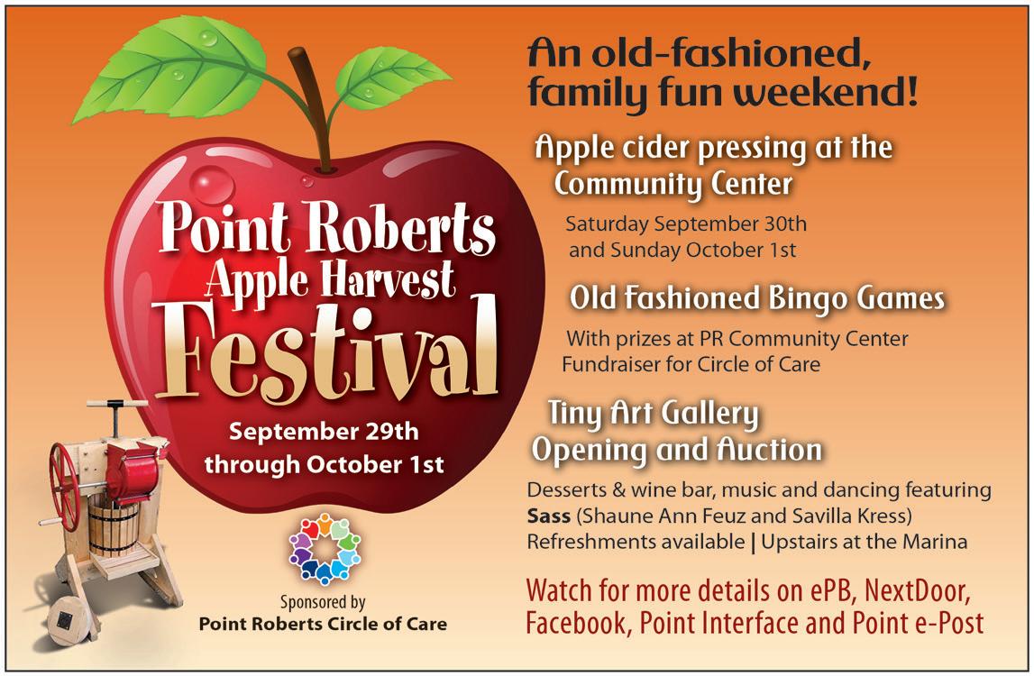 3 Septtember 2023 • allpointbulletin.com Hugh Wilson, Real Estate Broker Call or text: 604-910-5968 or 360-945-1010 or email hwilson@pointroberts.net NATIONAL REAL ESTATE Iconic Point Roberts building, The Roof House on Marine Drive. Residential. Almost 2 acres. PLUS Art Show on September 3. 403 West Bluff Rd. 2 BD, 2 BA view home. $499,000 OPEN HOUSE 10am-2pm on Sundays, Aug. 27 & Sept. 3. 2281 Uscandia Ln. 4 BD, 2 BA $600,000 PENDING! AMI FRIENDLY FAMILY FRIENDLY RESTAURANT & BAR PING PONG • DARTS • POOL • BIG SCREEN TVS • AIR HOCKEY On the West Side waterfront at the end of Gulf Rd. 360/945-REEF Mon, Tues & Thur, Fri • Open at 4pm Saturdays & Sundays • Open at Noon Please make reservations on the weekend. Sept. Hours: Open Thursday - Tuesday Monday Night Football Specials Starting Sept. 11: Deluxe burger and choice of bottle of Bud, Bud Light, Vodka/soda, or pop. $15 Bud, Bud Light bottles, Vodka/soda $3.50 each
