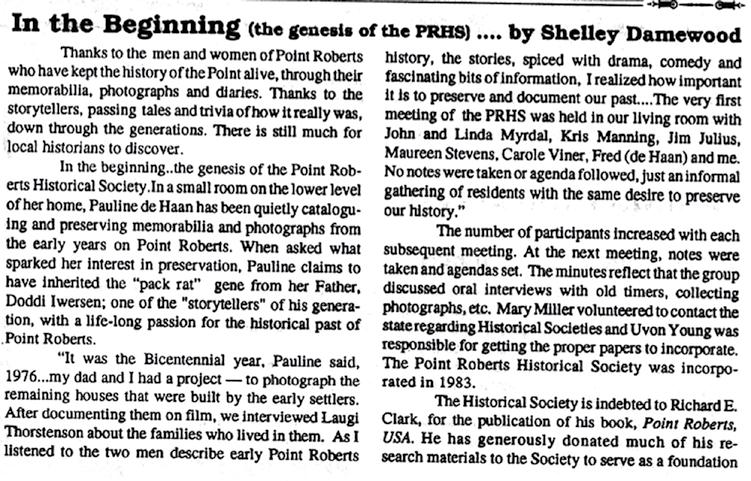 To help to share the APB’s 39th anniversary, the Point Roberts Historical Society looked into its archives and found our very first newsletter, Old News, from 2001. We would like to share an article by Shelley Damewood called “In The Beginning.”