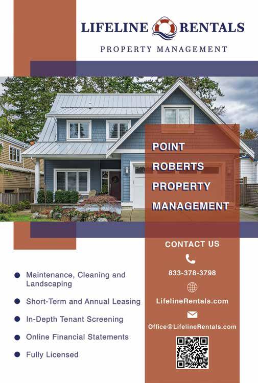 2 All Point Bulletin • May 2024 Ingrid Johnson ingridjohnson7@mac.com 206-391-0224 Tracy Evans tracy.evans@kw.com 206-658-5762 WESTERN REALTY 217 Marine Drive $1,425,000 SOLD! We know Point Roberts. We have years of experience in Real Estate and decades as Business Owners! The busy Spring Season is here. Call us to discuss buying, selling, and marketing your cottage, vacant land or home. Luxury Waterfront is our specialty. 591 Marine Drive $1,375,000 SOLD! 1541 Ocean View Lane $1,449,000 SOLD! 317 Marine Drive $1,499,000 PENDING! Nielson’s Building Center 391 Tyee Drive, Point Roberts, WA • 360.945.3116 Hours: Mon-Fri 8-5 • Saturday 9-5 • Sunday 10-3 Shop online: Visit www.NielsonsBuildingCenter.com Celebrating 61 years in business! 1963 - 2024 COLOSSAL SIDEWALK SALE Victoria Day Weekend & Memorial Day Weekend! ITEMS INCLUDE: outdoor furniture, bulk electrical, tv wall mounting kits, lighting, doors, windows AND MORE! 1345 Gulf Rd. Point Roberts, WA • 360-945-SALT • TheSaltWaterCafe.com SALTWATERCAFE SALTWATERCAFE OPEN FOR BREAKFAST, LUNCH & DINNER Wednesday to Sunday - 9am - 4pm Dinner Fri & Sat at 5pm EnjoyDeckDining ourGreatCocktails! FULLY LICENSED and JR DELTAYOUTHTHEATRE.COM MAY 3-12 E QUINOXTHEATRE promocode: POINTBOB Lina Holliday (360) 988-1832 linaholliday@kw.com linaholliday.kw.com Lot 1 Sunrise Dr, $180,000 1394 Rex Street, $63,000 1438 Gulf Rd. $545,000 Two exceptional opportunities await with a 6.94-acre property offering combined commercial and residential zoning. YOUR PROPERTY, MY COMMITMENT: Real Estate Excellence Every Step of the way! Lot 4 Drake Ave, $63,500 JUSTLISTED SOLD! SOLD! SOLD!
