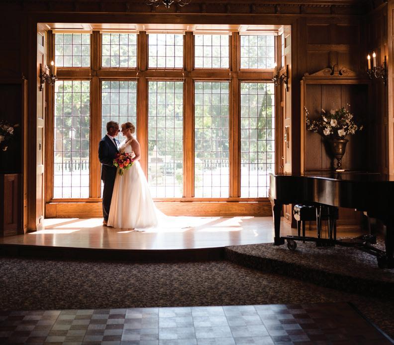 Glowing chandeliers, hardwood floors, a romantic balcony and sandstone fireplace create unique ambiance. 5,000 sq. ft. allows you to have your wedding and reception in one place. Your day will be remembered in this beautiful indoor venue. p. 43