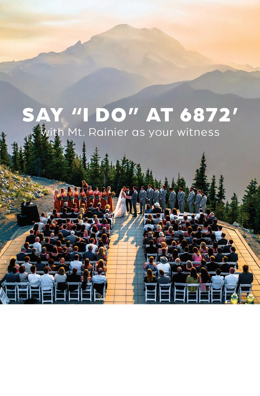 crystalmountainresort.com/weddings events@skicrystal.com Say “I Do” at 6,872’ with Mt. Rainier as your witness. We welcome scenic outdoor and indoor weddings yearround. We are located on the Northeast corner of Mt. Rainier National Park, just 75 miles from Seattle and 60 miles from Tacoma. p. 37