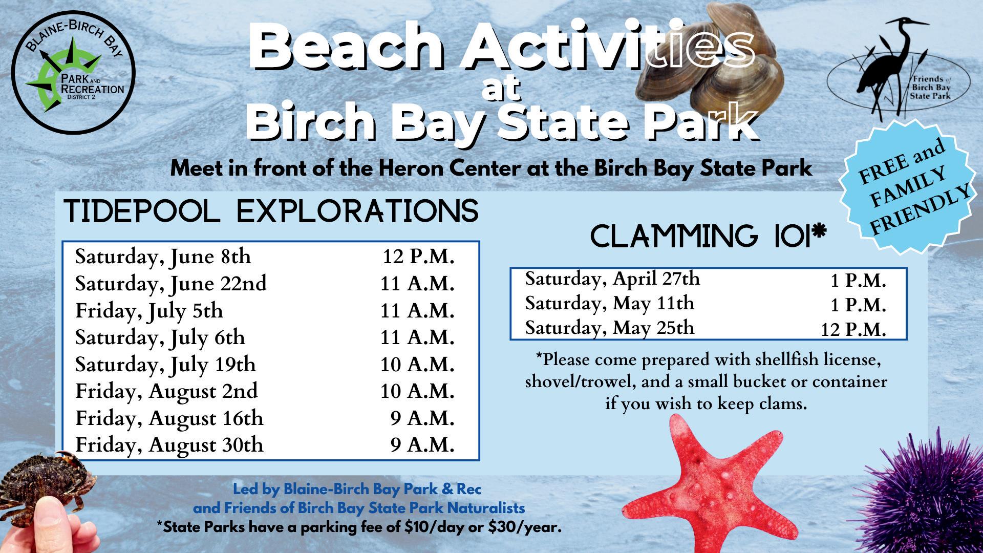 Clamming 101: Saturday, May 25, 1 p.m., Birch Bay State Park Heron Center. Learn shellfish regulations, how to dig for clams, clam species and methods of cleaning and cooking. Bring your shellfish license, shovel/trowel and a small bucket if you wish to keep clams. Led by Blaine-Birch Bay Park and Recreation and Friends of Birch Bay State Park naturalists. Free. Info: bbbparkandrec.org.