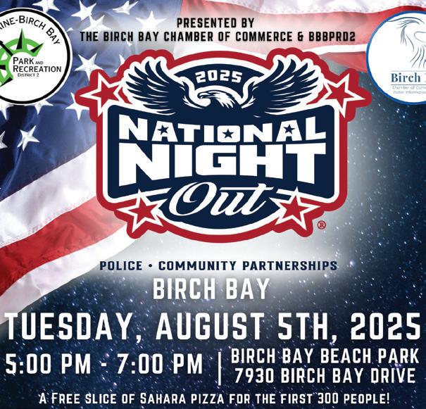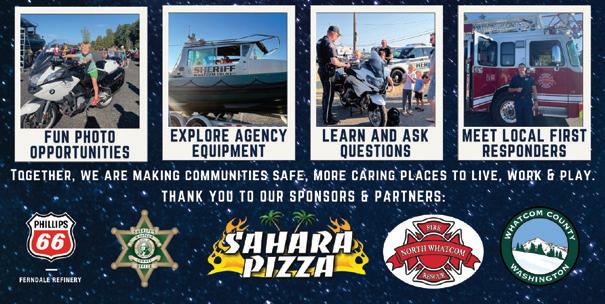National Night Out: Tuesday, August 5, 5–7 p.m., Birch Bay Beach Park, 7930 Birch Bay Drive. Enjoy fun photo opportunities, explore agency equipment, learn and ask questions, and meet local first responders. Free slice of pizza and water for the first 300 attendees. Info: birchbaychamber.com.