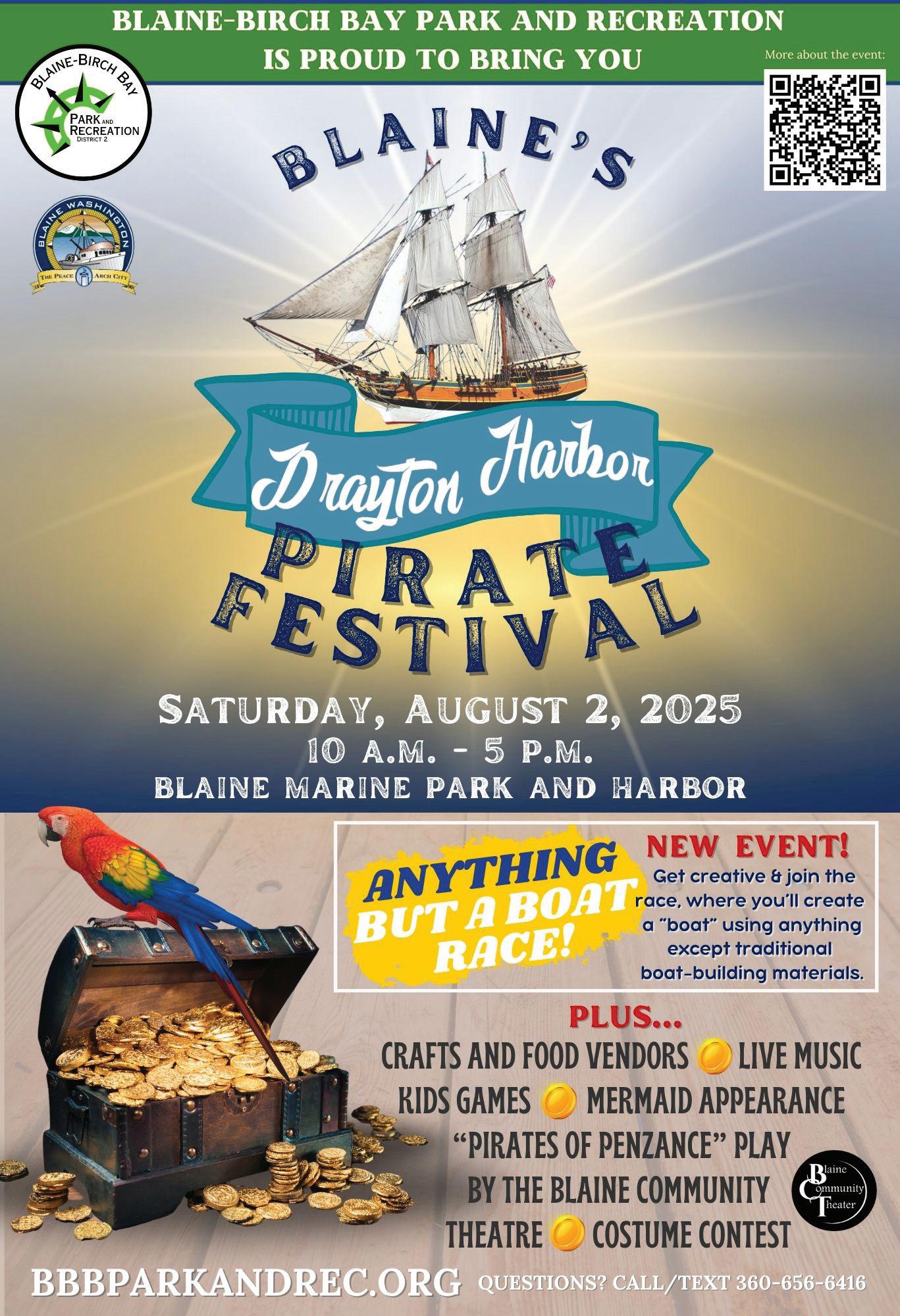 Pirate Festival: Saturday, August 2, 10 a.m.–5 p.m., Blaine Marine Park. Live music, food and craft vendors, family-friendly games and activities, mermaid appearance for kids, Pirates of Penzance performance by Blaine Community Theater, water balloon fight, “anything but a boat” race, and costume contest for all ages. Info: bbbparkandrec.org.