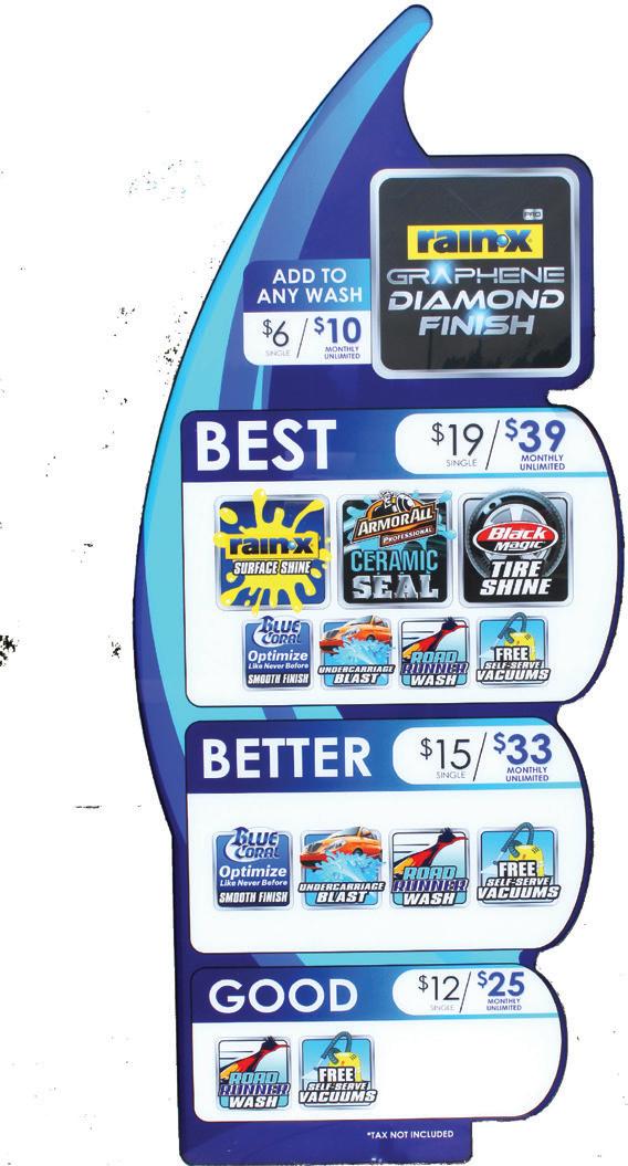 The services include a “good” wash for $12 for a single wash or $25 for a month of unlimited washes, a “better” wash for $15 or $33 monthly unlimited that also includes an undercarriage blast and smooth finish, and a “best” wash for $19 or $39 monthly unlimited that adds on a tire shine, ceramic seal and surface shine. Each wash includes a free vacuum, and a Rain-X Graphene Diamond Finish is available as an add-on.