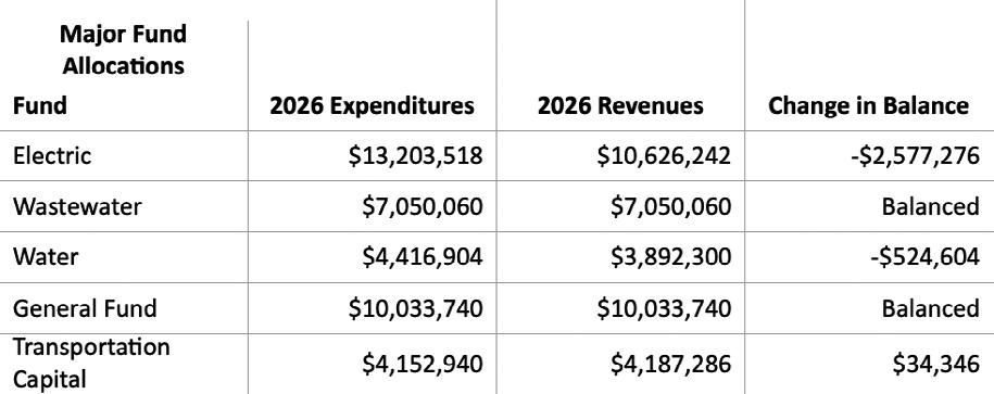 The electric fund’s planned $2.6 million drawdown stands out, reducing reserves from $3.2 million to just $637,000 – an 82 percent depletion that could signal future rate adjustments or major capital projects.