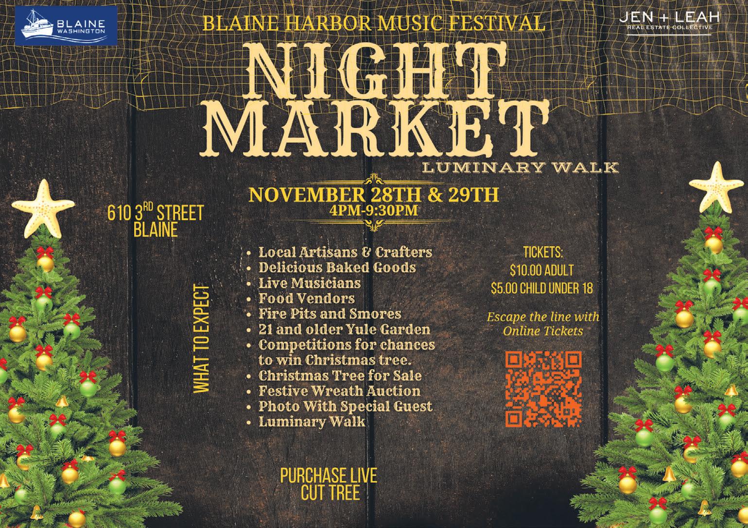Night Market and Luminary Walk: Friday and Saturday, November 28 and 29, 4–9:30 p.m., Blaine Library lot, 610 3rd Street. Shop local art and baked goods, live music, food vendors, fire pits, 21+ Yule garden, competitions for Christmas trees, wreath auction, photo with special guest and luminary walk. Tickets: Adults $10, kids under 18 $5 at the event or blaineharbormusicfestival.org. Proceeds benefit Blaine Harbor Music Festival.