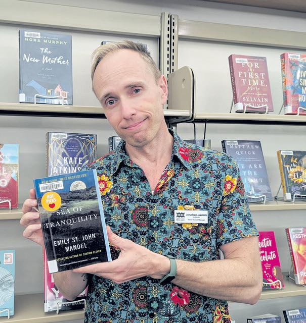 s Blaine Public Library branch manager Jonathan Jakobitz holds a copy of “Sea of Tranquility” by author Emily St. John Mandel. “Sea of Tranquility” is the August selection for the monthly Books and Bites book club, which will be held Friday, August 18 at the Blaine library.
