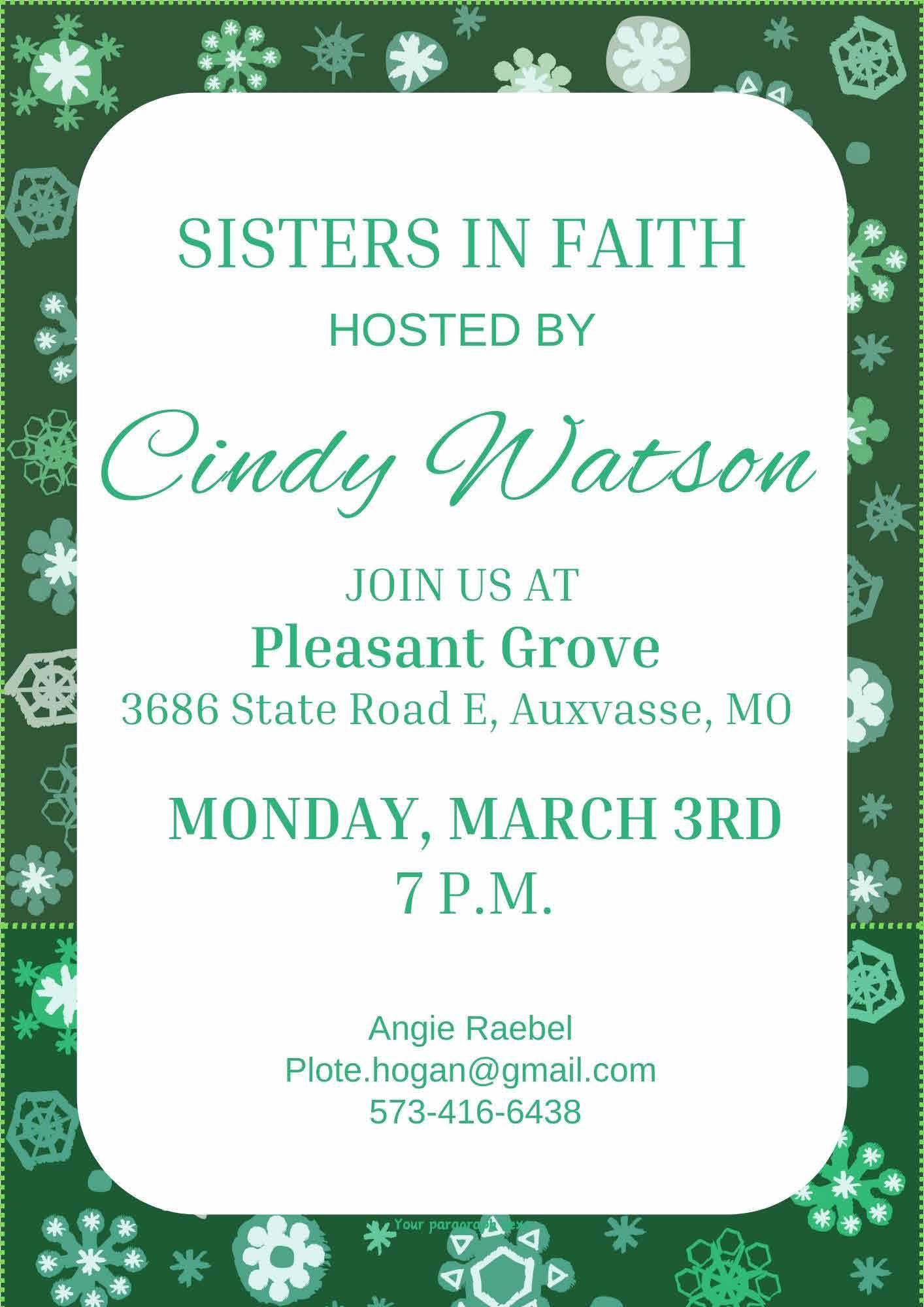 Cindy Watson will host Sisters in Faith at Pleasant Grove on Monday, March 3, at 7 p.m. For more information, contact Angie Raebel at 573-416-6438 or email Plote.hogan@gmail. com.