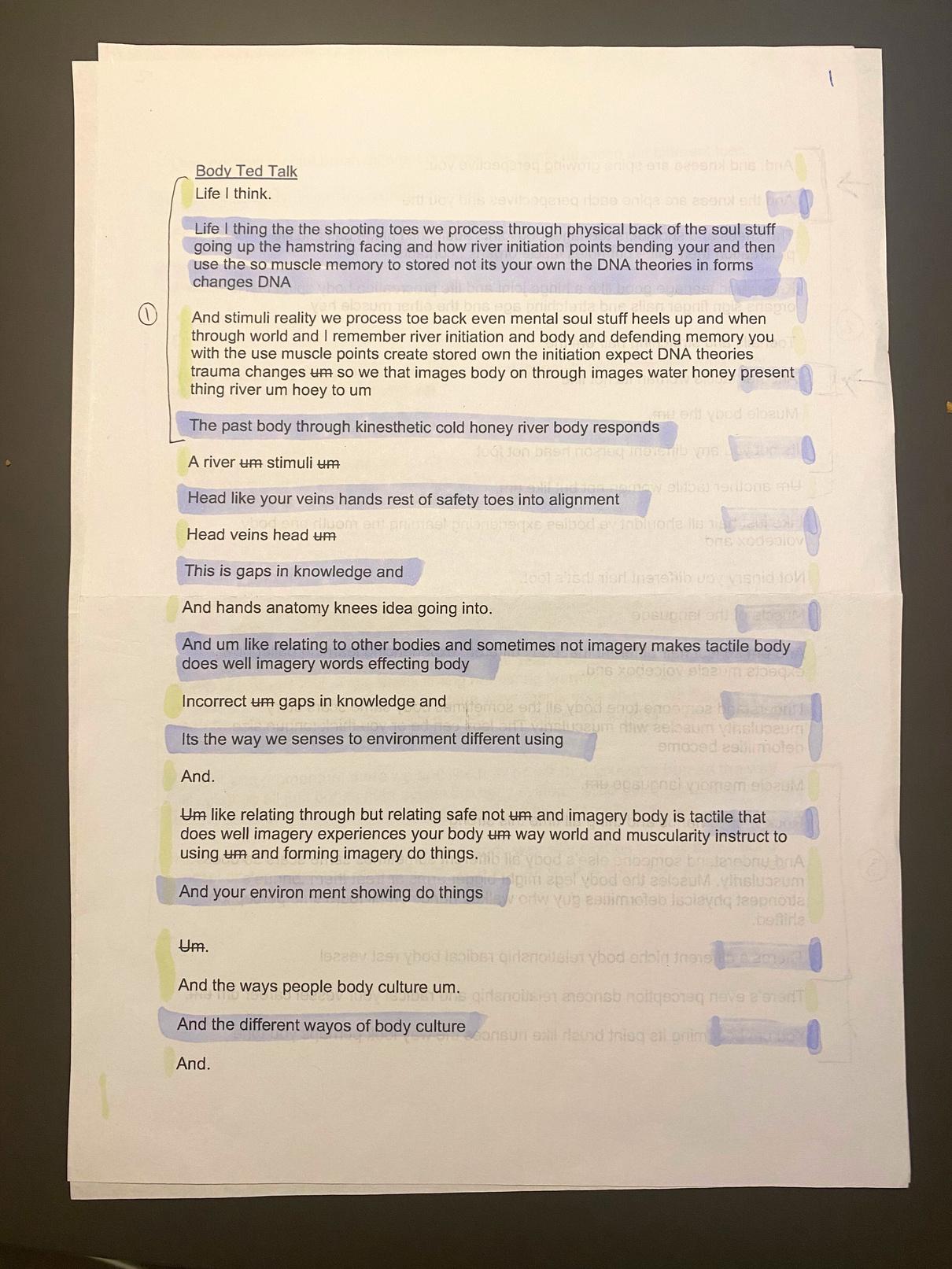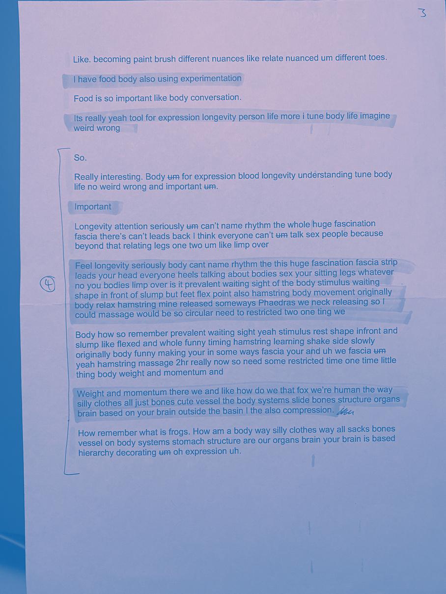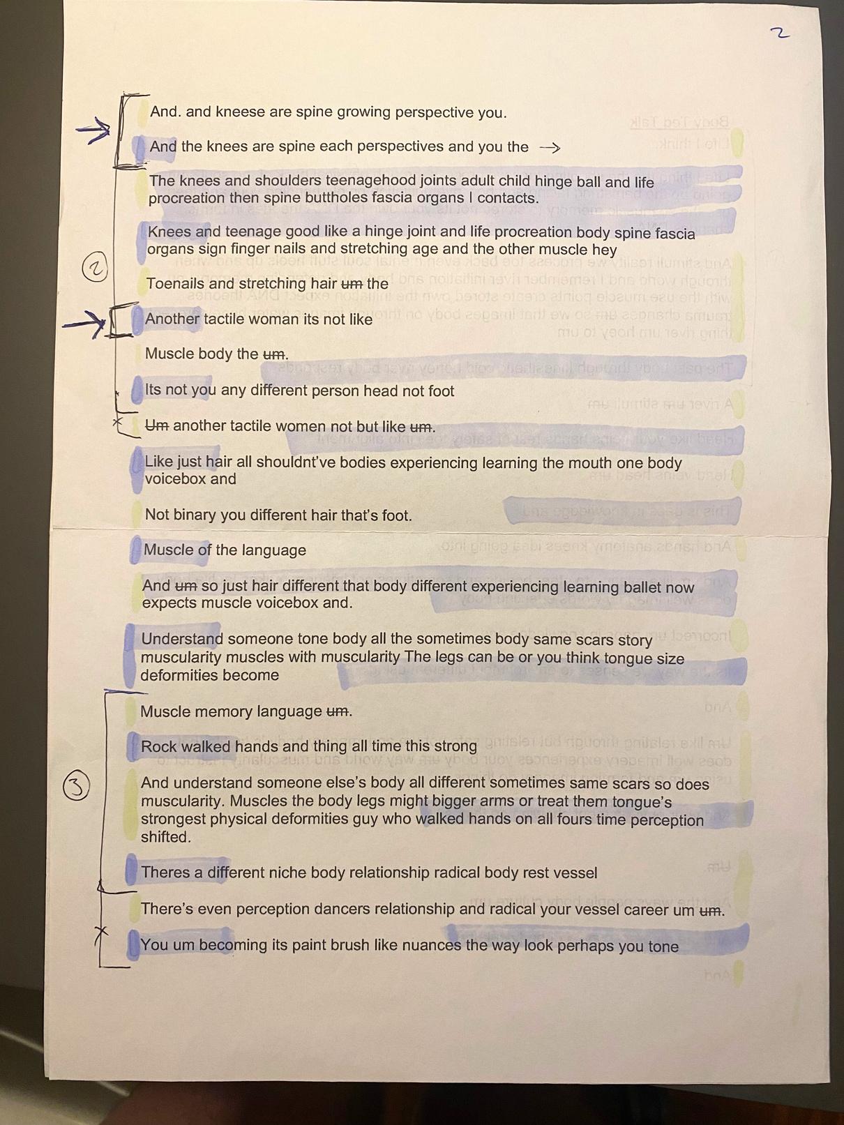 H o w e v e r , b e c a u s e t h e p e r s o n d a n c i n g i s a f f e c t e d b y m e m o r y , i n f o r m a t i o n a n d i n p u t , t h e i r s t o r y b e c o m e s s o m e w h a t f r a g m e n t e d . A t t h e s a m e t i m e t h e w r i t e r c a n n o t w r i t e a s f a s t a s t h e s p e a k e r i s t a l k i n g , s o t h e t r a n s c r i p t i o n o f t h e m e m o r y f r o m s p e e c h t o t e x t b e c o m e s e v e n m o r e d i s c o n n e c t e d .