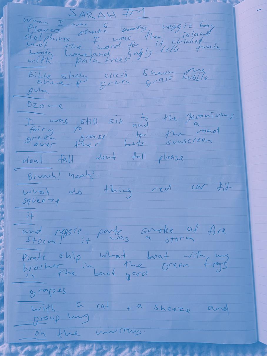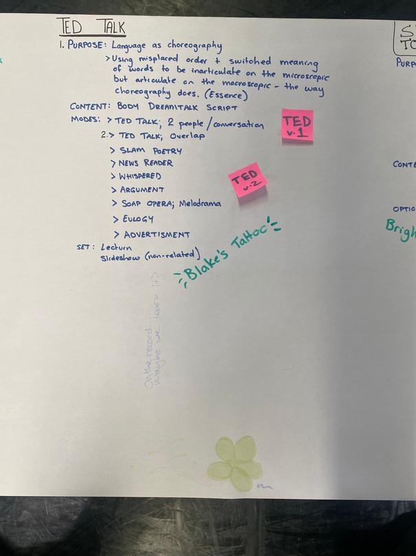 T h e f o l l o w i n g e x c e r p t s o f t e x t h a v e b e e n g e n e r a t e d u s i n g a p r a c t i c e o f d a n c i n g , m e m o r y a n d t r a n s c r i p t i o n c r e a t e d b y P h a e d r a B r o w n a n d S a r a h S a x o n . T h e p r o c e s s i s a s f o l l o w s :