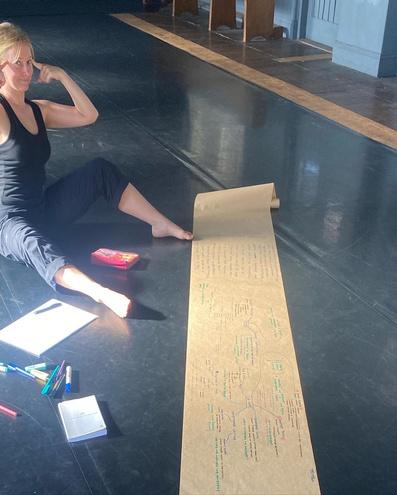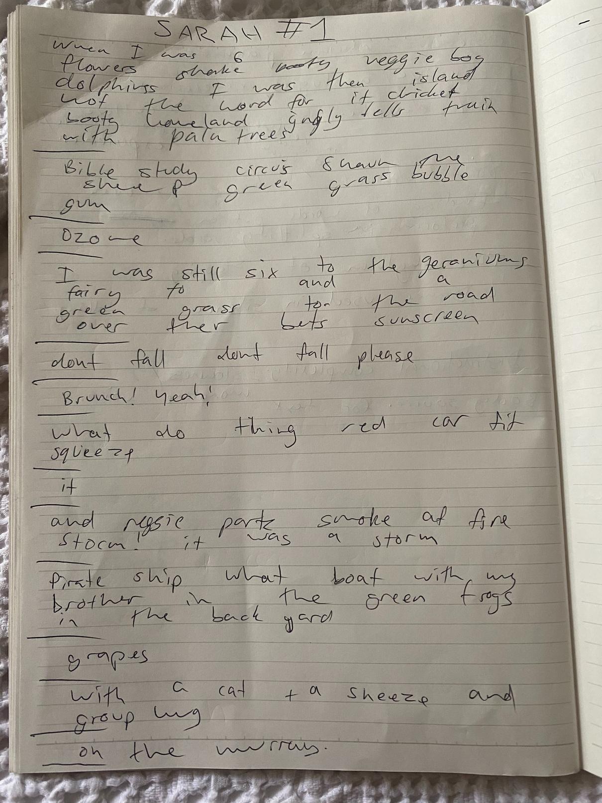 She places herself in the centre of the empty space She sits, pen poised above notebook