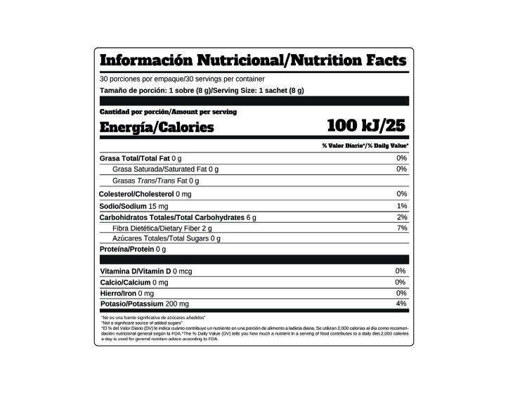Consumir 7 sobres al día. Recomendado para personas mayores de edad. No apto para mujeres embarazadas, con historial de cirugía de colon, enfermedad de Crohn, hemorroides severas y colitis ulcerosa.