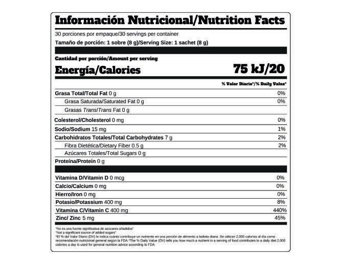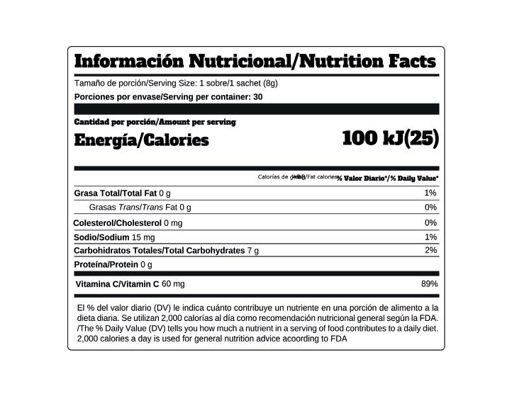 Cam Camu en polvo, Naranja en polvo, Betalaína, Germen de Trigo y endulzado con Stevia.