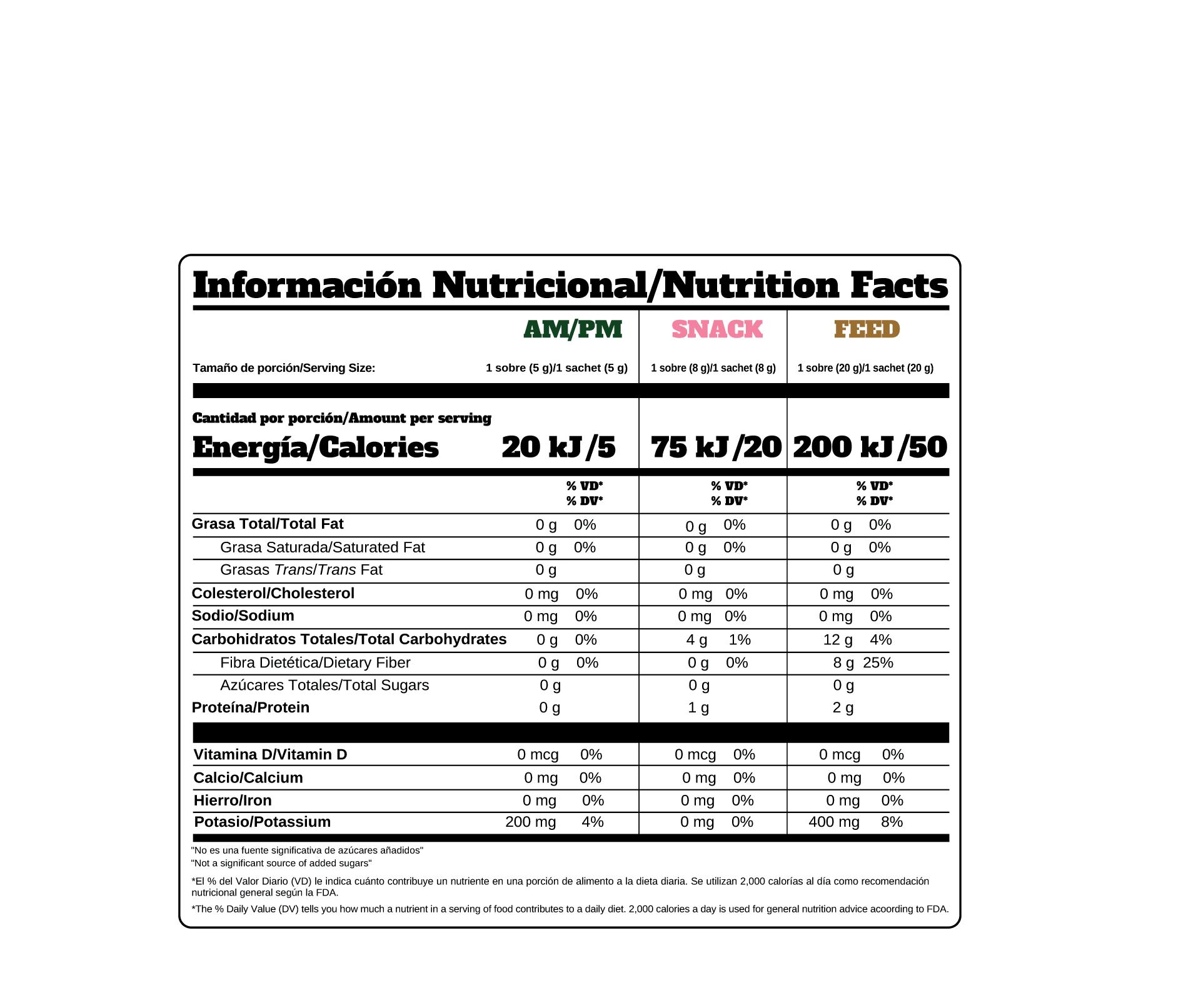 FEED: Tomar 1 sobre en el desayuno, almuerzo y cena.