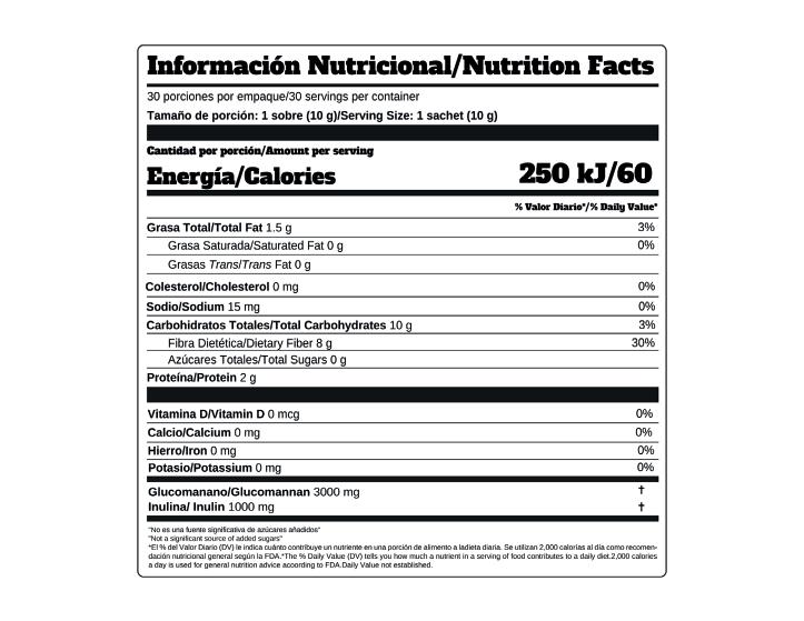 Avena molida, Arveja en polvo, Glucomanano en polvo, Inulina en polvo, Semillas de calabaza, girasol, ajonjolí en polvo, aceite de aguatae en polvo.