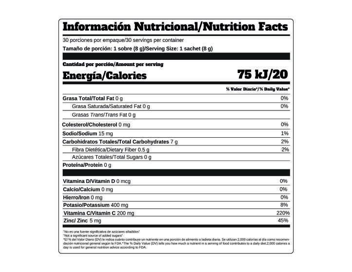 Fresa y piña en polvo, flor de Jamaica, cocoa, orégano y canela en polvo, Vitamina C.