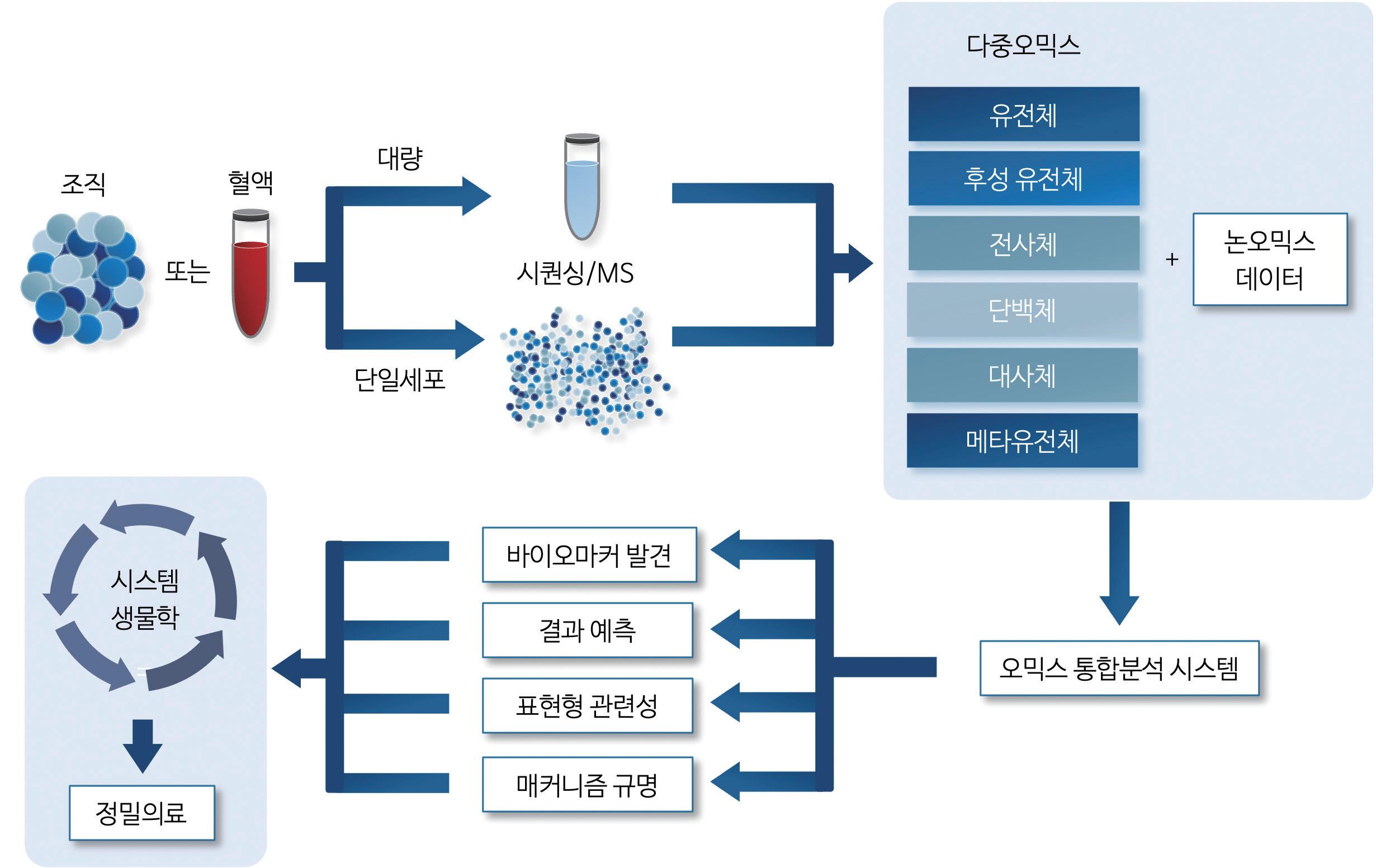 이에 따라 정밀의료와 각종 검사의 기반이 되는 오믹스 분석도 함께 주목받고 있다. 오믹스(Omics)란 생체를 구성하는 물질을 포괄하는 개념임과 동시에 이를 연구하는 학문분야이다. 그 종류에는 유전체(genome), 전사체 (transcriptome), 단백체(proteome), 대사체(metabolome), 후생유전체(epigenome), 미생물체(microbiome) 등이 있다[2]. 과거에는 단일 오믹스 분석에 그쳤다면, 오늘날에는 앞서 언급한 생체물질에 관한 여러 데이터를 통합하여