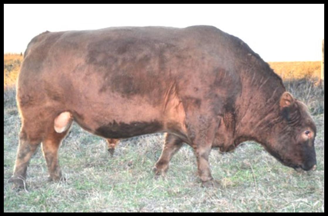 The Romosinuano breed is a tropically-adapted Bos Taurus breed that originated in the Sinú valley of northern Colombia, South America near the equator. They appear to be the most heat tolerant of the various breeds we are working with. Generalissimo is the result of breeding a Romo cow to an extremely stout Johnny Mizzou son. He was the best of the five Romo-cross bulls we sold at our 2020 Alabama sale. Generalissimo was the only one of the five with 5-star fleshing ability. He was also the only one that combined a 5+ hair coat with 5+ fly resistance. He is co-owned with the D Bar 7 Ranch in Indiana.