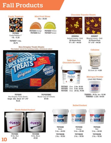 Satin Ice Chocolate Fondant 756055 55 Gram Jar • 4.50 Meringue Powder (Just Add Water) 757322 Choc 2 lbs. 10.50 757325 Choc 5 lbs. 24.50 757335 Choc 20 lbs. 79.95 757025 Rice Krispies Treats Sheets Single 2lbs. Sheet 12” x 15” 19.25
