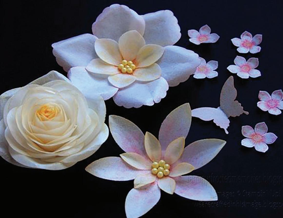 Wafer papers are delicate sheets of edible paper, typically rice-based, which are safe for consumption, imparting little flavor to the cake. Wafer paper can be manipulated in a number of ways, making it a versatile medium in creating a number of different cake decorating designs.