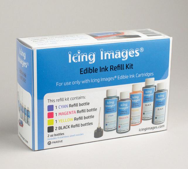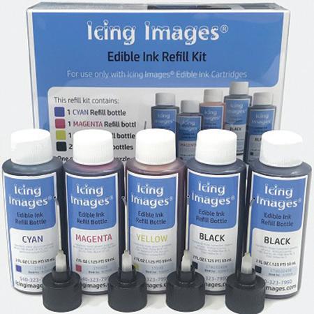 Icing Images Refill Ink is a great way to save money on edible printing. These refills are designed to work with both Elite and Gold Series Cartridges and are refillable directly in the printer. Each bottle has approximately 6 refills. Refill each cartridge up to three times before replacing your cartridge. While refilling is not an exact science, it does save a lot of money and it is always recommended that when refilling you keep an extra set of cartridges in stock.