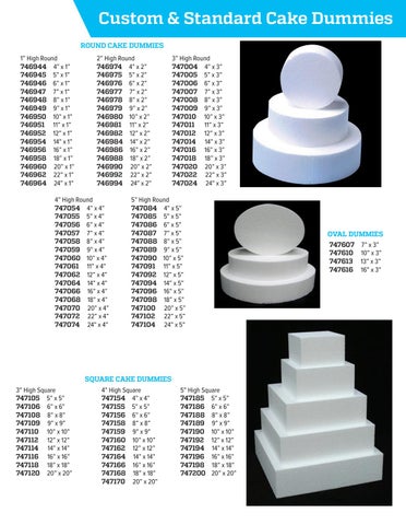 Custom & Standard Cake Dummies Page Title ROUND CAKE DUMMIES 1” High Round 746944 4” x 1” 746945 5” x 1” 746946 6” x 1” 746947 7” x 1” 746948 8” x 1” 746949 9” x 1” 746950 10” x 1” 746951 11” x 1” 746952 12” x 1” 746954 14” x 1” 746956 16” x 1” 746958 18” x 1” 746960 20” x 1” 746962 22” x 1” 746964 24” x 1”