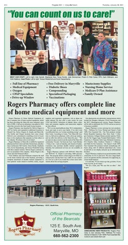 supplies, and respiratory equipment. Ask us about our rental options! We also offer a wide variety for your CPAP and BiPAP. Selections of diabetic shoes, colostomy and urostomy supplies, and mastectomy supplies are also offered. “We’re a one-stop healthcare shop. We’re independent, local, and ready to serve your family. If we don’t treat you differently here, we’ve done something wrong”, said Rick Carter. According to Carter, “Our Maryville location is a full-service pharmacy with a drive-up window, and we offer free delivery in the Maryville area.” “We are open six days a week to suit the needs of the Maryville community,” he said. Our hours are 8 am - 6 pm Monday - Friday, 8 am - 2 pm on Saturday, and closed on Sunday. Customers may purchase durable medical equipment Saturday, but customized services are not available on that day. Rogers Pharmacy partners with MOSAIC Maryville and MOSAIC St. Joseph in providing 340B prescriptions. This program allows certain drugs to be filled at a reduced price and has been very viable for our customers. Give us a call if you would like to have more information about this savings program.