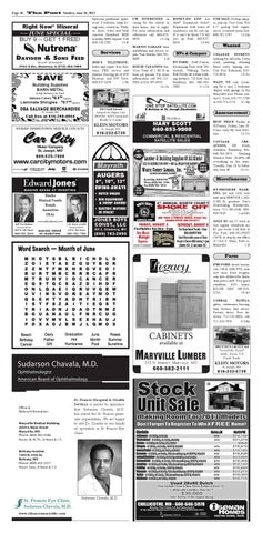 Miscellaneous HY-PRESSURE WASHERS, hot and cold, new and used, SERVICE 1,2004,500 lb. pressure. Van’s Distributing, Braddyville, Iowa. 712-589-3348, 888984-7839. 1-eowtfc ONLY $5! All 25 word or less regular classifieds are $5 per week. Call Rita at The Post, 660-582-POST (7678) or stop by our office at 1316 S. Main, Suite A, Maryville. 1-tf